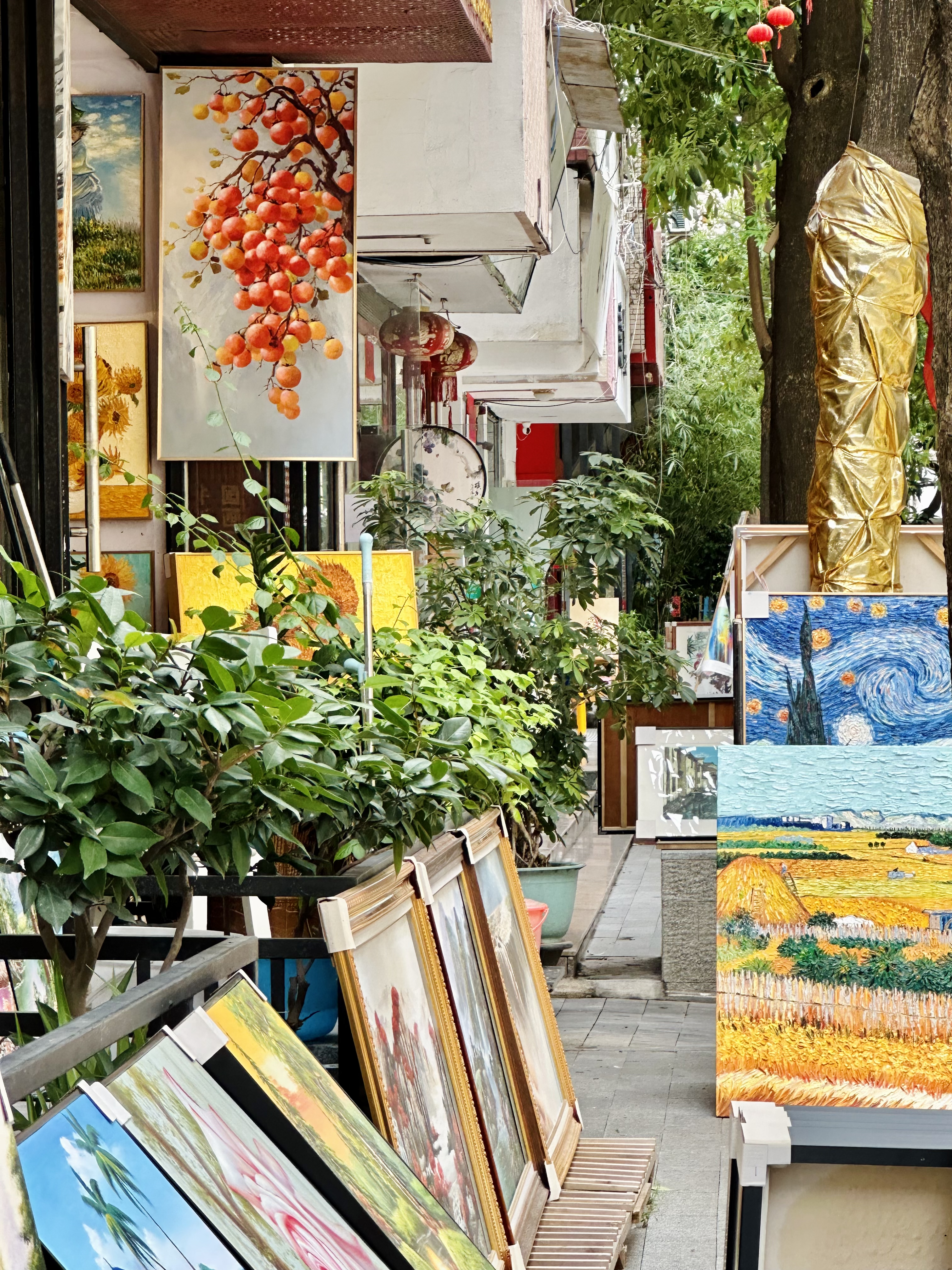 这个不算大的文化街区云集了全国各地数千名画师,大小画廊及门店有上千家,油画从店里一层一层码到店门口,写实的、抽象的、肖像画、风景画,各种风格都有。来到这里,沿着曲曲绕绕的小路,随处都可以“看展”。