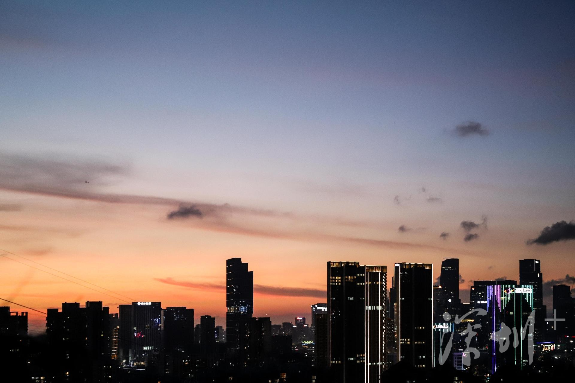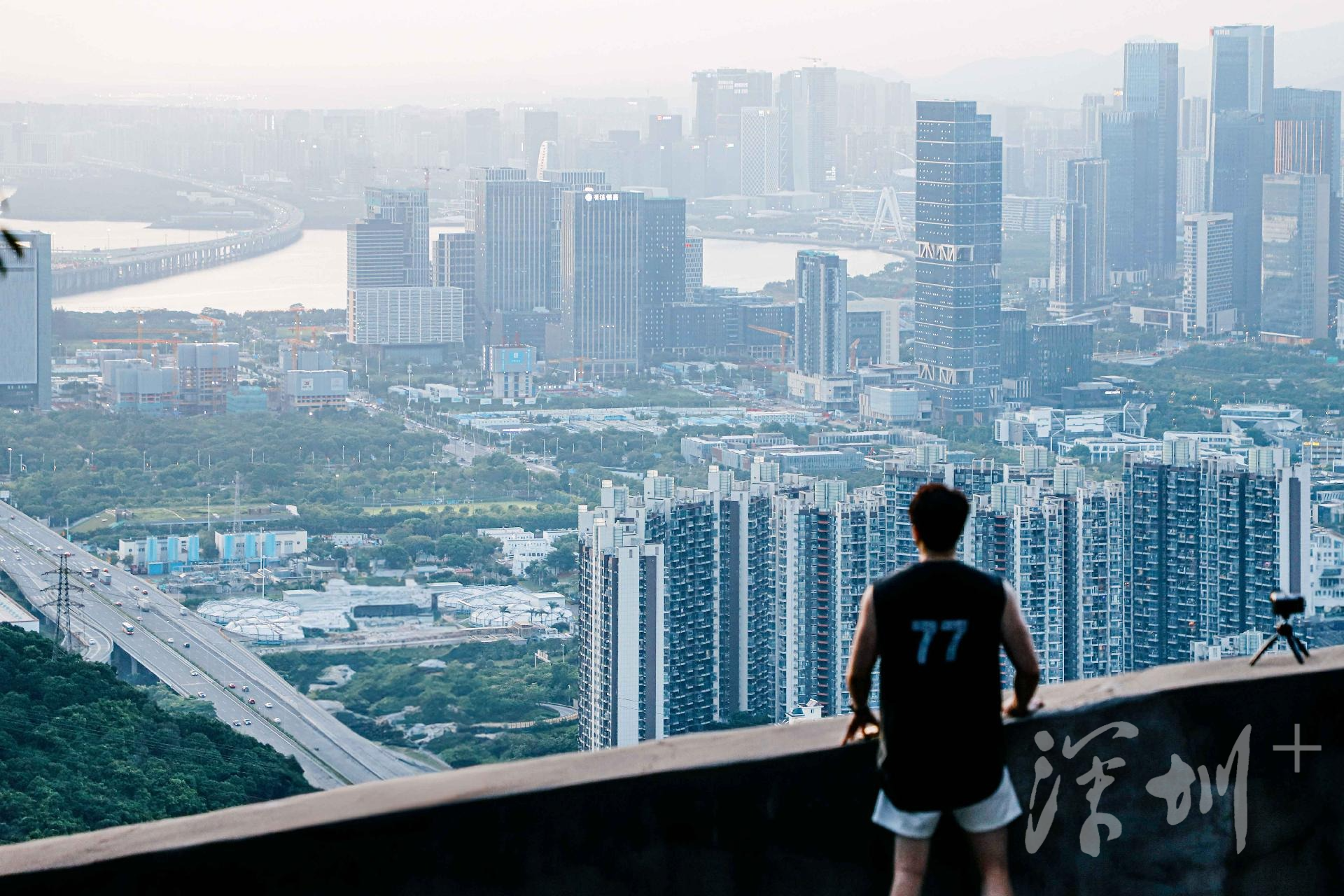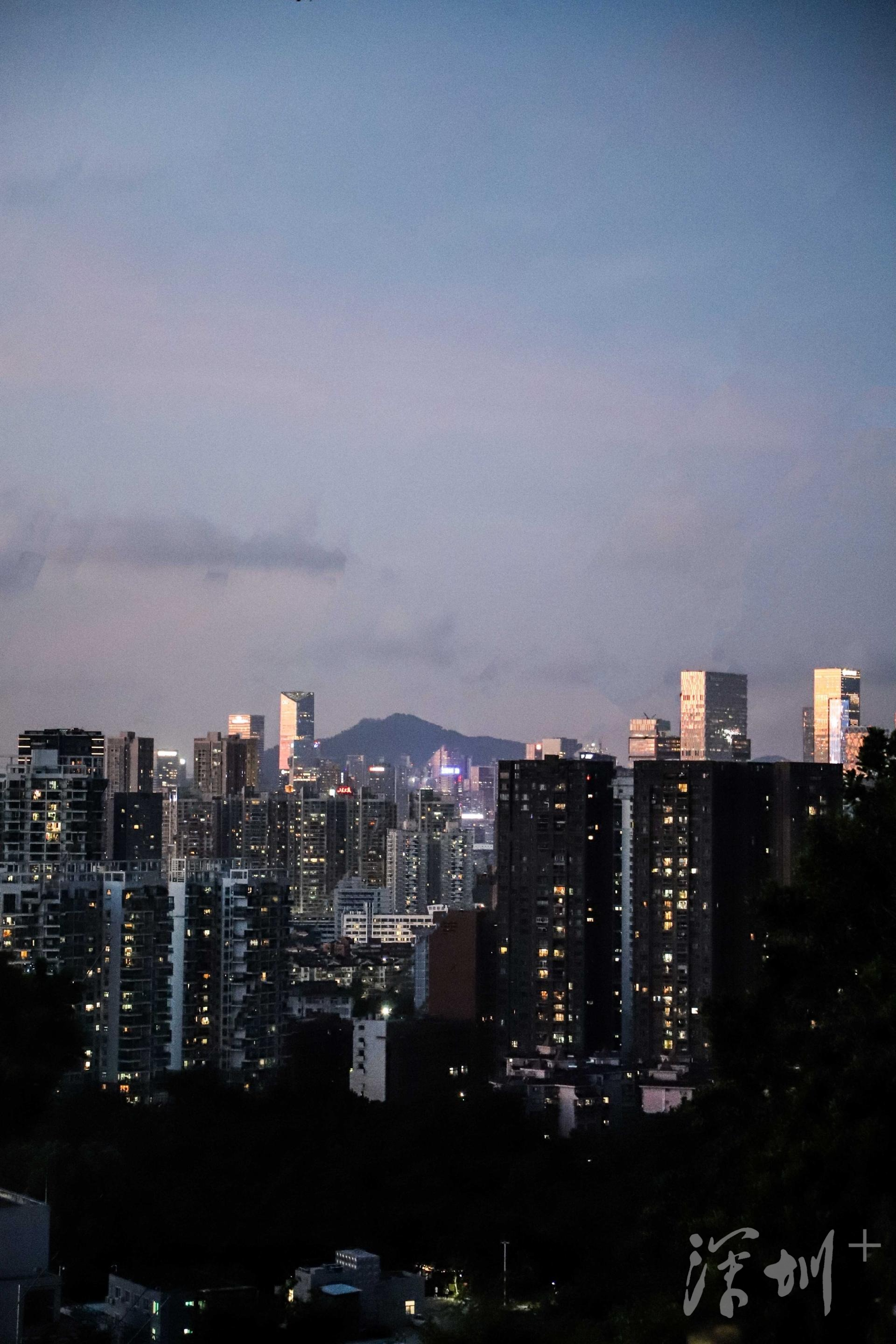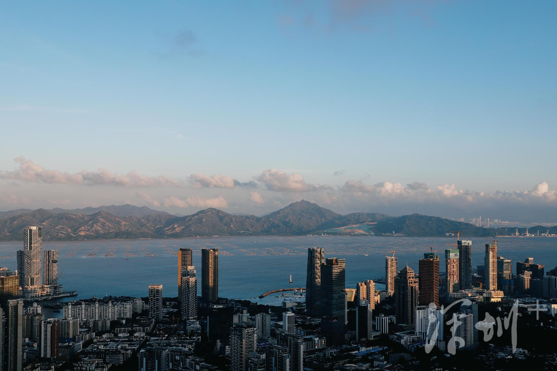 东面、北面则是城市建筑,人类打造的建筑景观如此宏阔而震撼:高楼大厦鳞次栉比,在山海之间构筑着全新的地面和天空的样貌,宣示着人类生活的智慧与文明的力量。