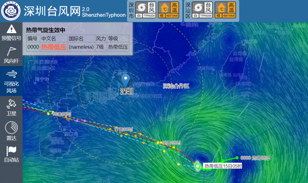 7月15日早晨05时,热带低压中心位于深圳市东南方约701公里的海面上,中心附近最大风力7级(15米/秒),中心最低气压1000百帕。