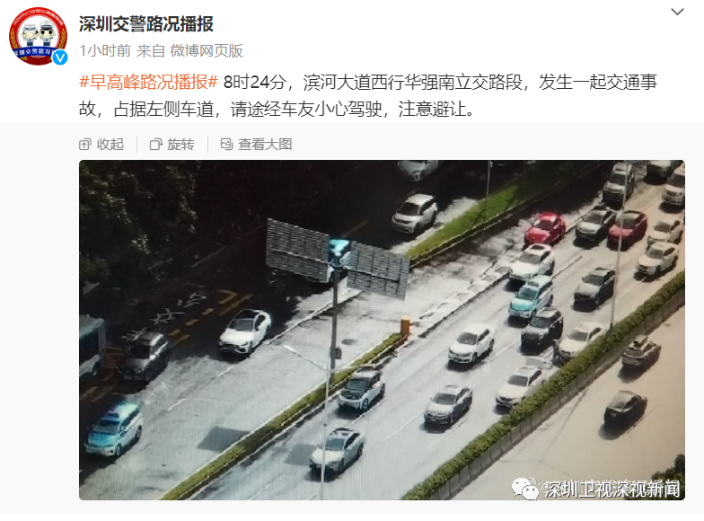 上午8时许,滨河大道西行华强南立交路段、北环大道西行皇岗立交路段等,相继发生交通事故。交警部门提醒,途经车友小心驾驶,注意行车距离。