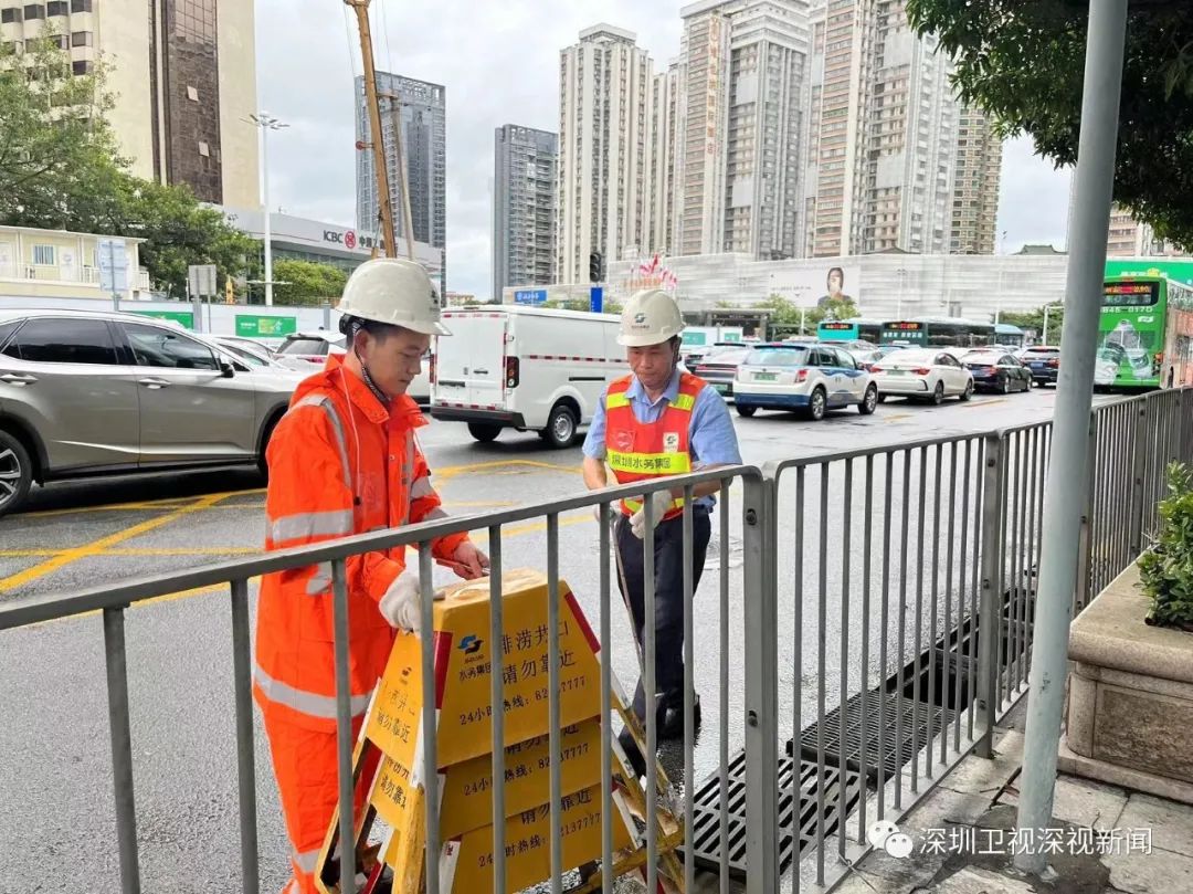 在深圳大剧院易涝点,水务局工作人员正在此处驻守,以便及时进行排水管网清淤疏浚工作,保障车辆顺利通行。