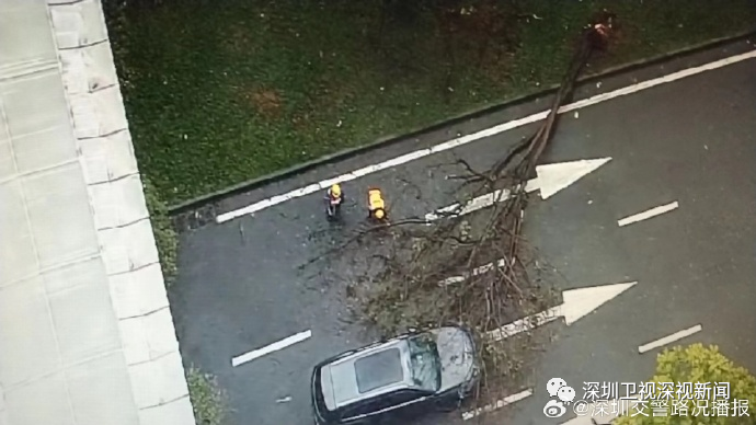在华强北主干道,记者看到,一些市政部门的工作人员正在执勤,清理路上的积水和树枝等。9时51分,北环大道辅道东行龙井天桥路段,受台风影响出现树木倒伏,占据左侧两条车道,相关部门迅速赶往现场清理。