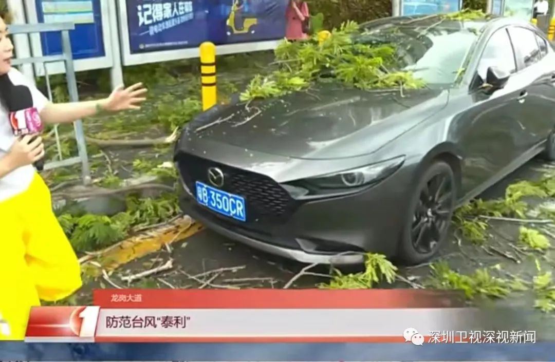 在龙岗大道靠近荣超花园公交车的车道旁边,记者注意到,受台风天大风影响,有一辆汽车车身被砸下来的树枝、树叶遮盖,车主正在联系保险公司理赔,目前尚不确定车辆破坏程度。同时,在车道旁边,摆放在自行车区域的车辆也被吹得七歪八扭。