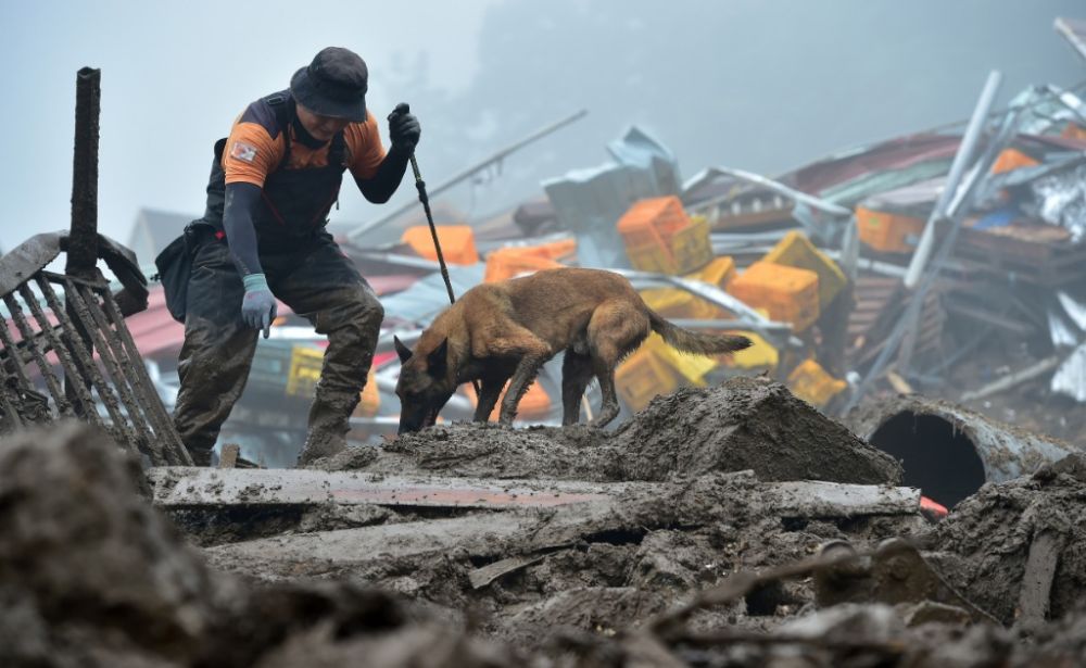 7月16日,在韩国庆尚北道醴泉郡,救援人员在因暴雨引发山体滑坡的村庄内搜救。新华社/纽西斯通讯社