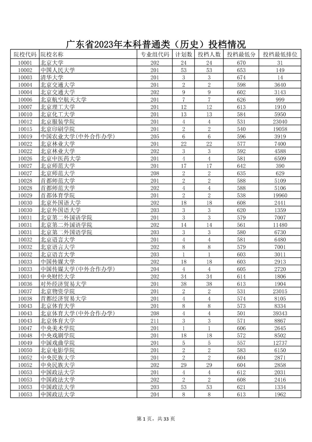 广东省2023年本科普通类(历史)投档情况
