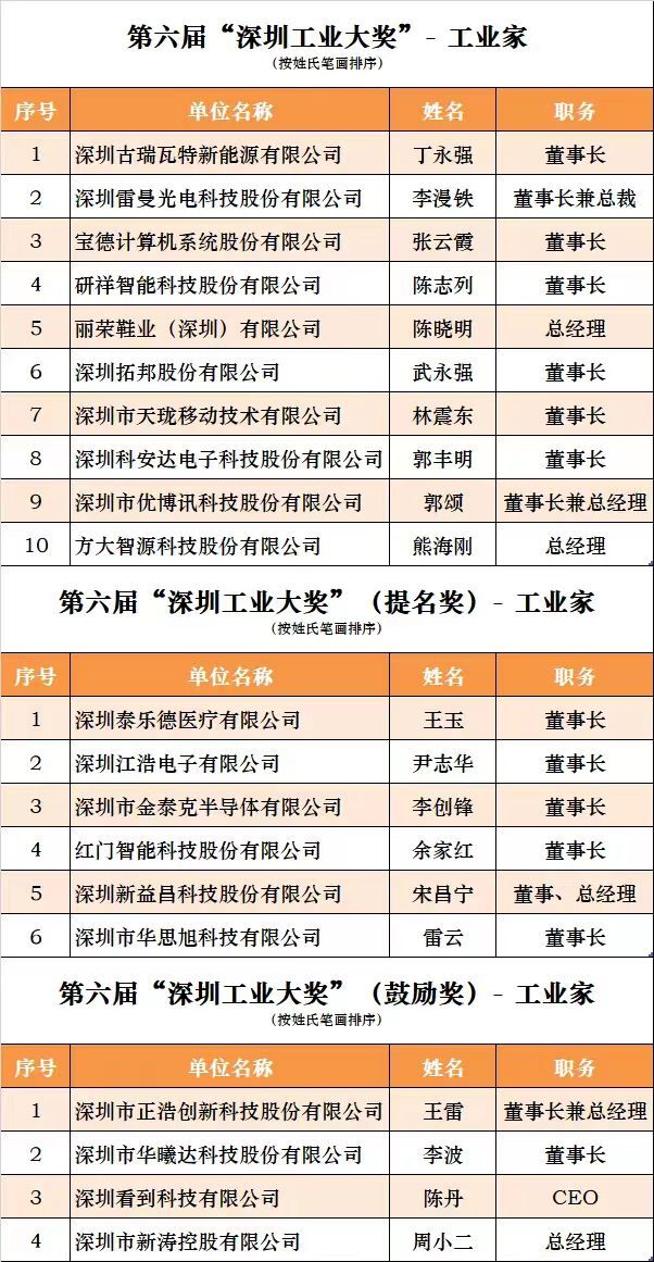 名单显示,TCL华星、洲明、光韵达等10家企业拟获“深圳工业大奖”企业,研祥智能科技股份有限公司董事长陈志列、深圳雷曼光电科技股份有限公司董事长李漫铁、深圳拓邦股份有限公司董事长武永强等10位企业家拟获“深圳工业大奖”工业家,欣旺达的“动力电池系统安全性关键技术及应用”、南玻集团的“三银Low-E建筑节能玻璃”、领威科技的“Dreampress12000T超大型智能压铸单元”等10个项目拟获“深圳工业大奖”项目。