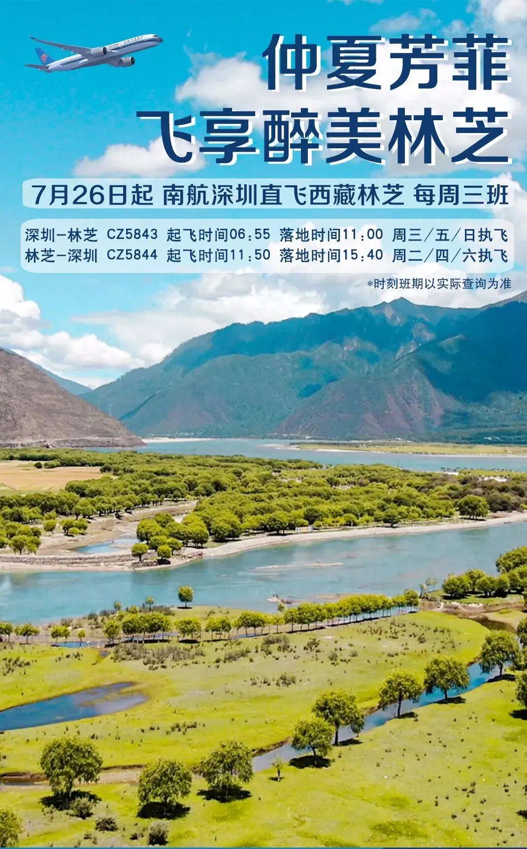 7月26日起,南方航空新增深圳=林芝直飞航班,进一步方便市民朋友们趁着暑期游契机打卡神秘西藏,只需4小时直抵“西藏江南”!