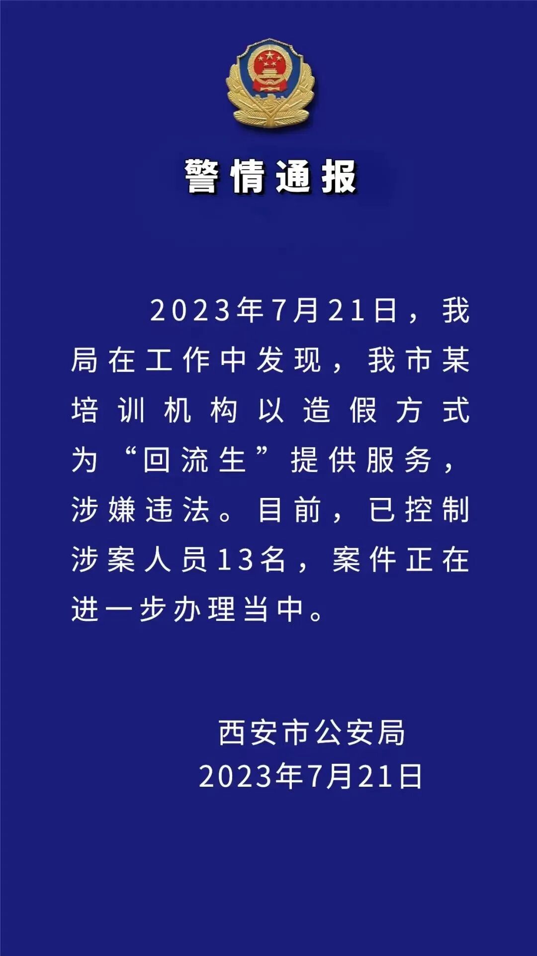 7月21日晚,西安公安发布警情通报,发现西安市某培训机构以造假方式为“回流生”提供服务,涉嫌违法。目前,已控制涉案人员13名,案件正在进一步办理当中。