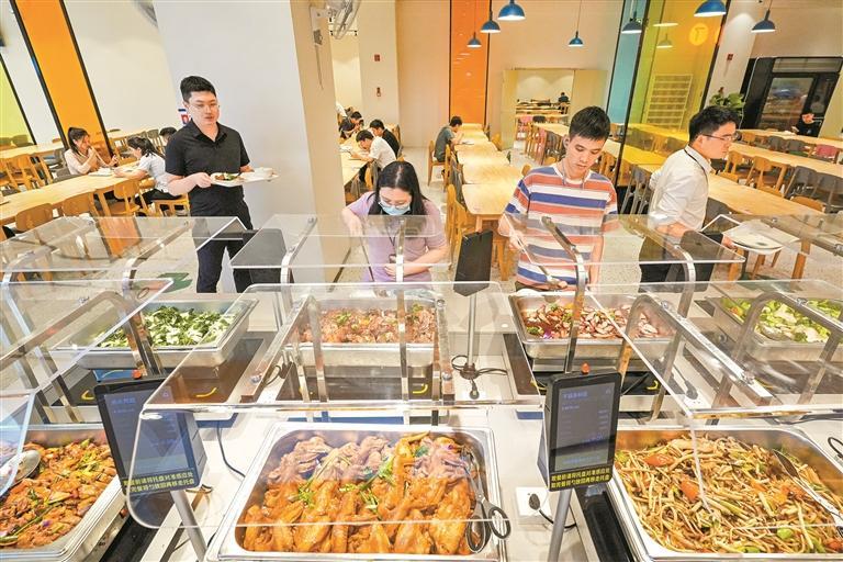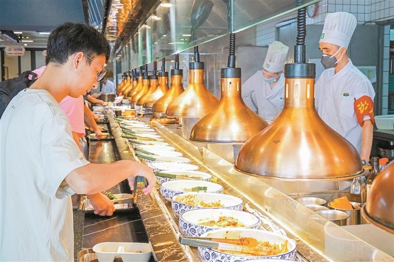 ▲7月18日中午,南山区卓越熟食中心内,精心烹制的菜肴丰富多样,市民根据自己的喜好选取菜品。