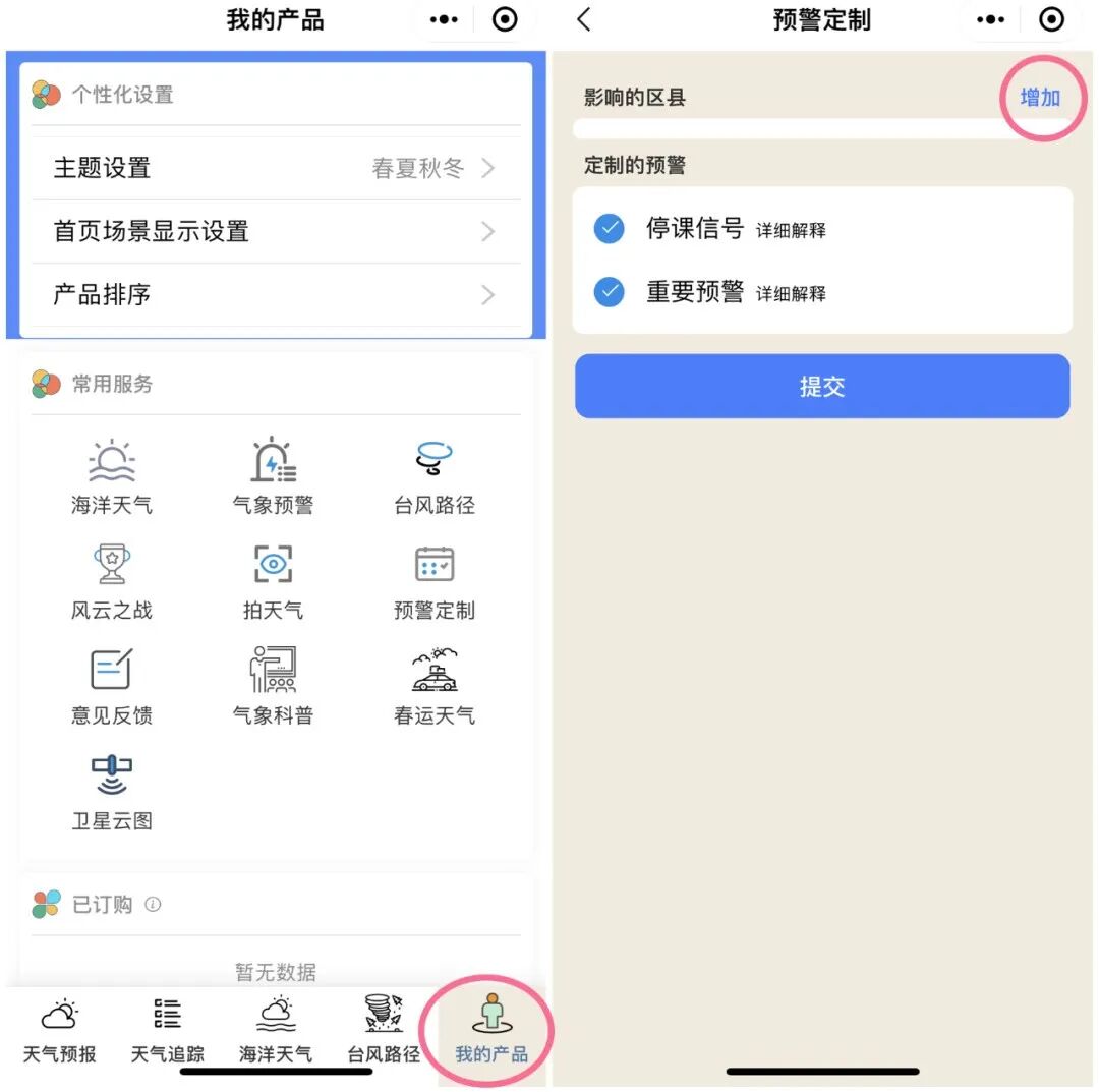 进入“缤纷微天气”小程序,点击我的产品->预警定制->添加所在区县->勾选停课预警信号或重要预警信号,就能收到广东天气官方发布的台风、暴雨、雷雨大风、冰雹等预警信号啦!