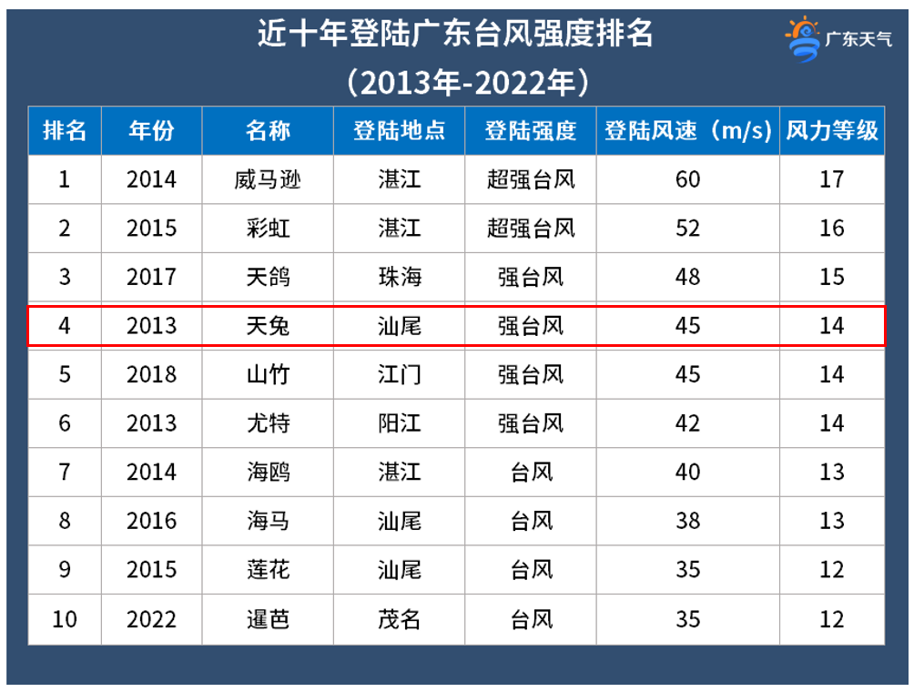 从过去10年(2013年至2022年)登陆广东最强台风排名来看,2013年的“天兔”为上一个登陆粤东的强台风,因此考虑“杜苏芮”将成为近10年来登陆或严重影响粤东的最强台风。