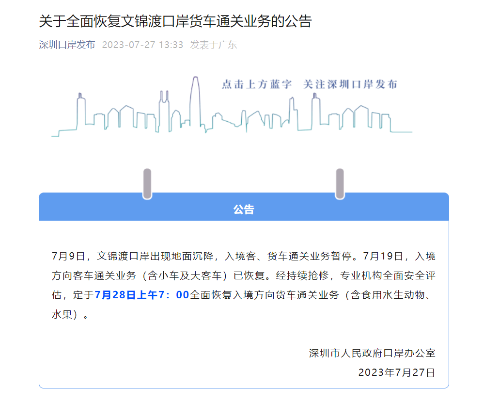 7月27日,深圳市人民政府口岸办公室发布《关于全面恢复文锦渡口岸货车通关业务的公告》。