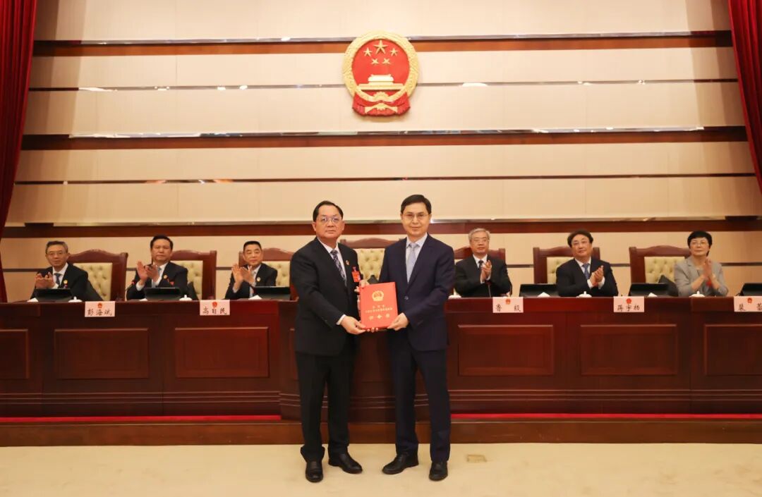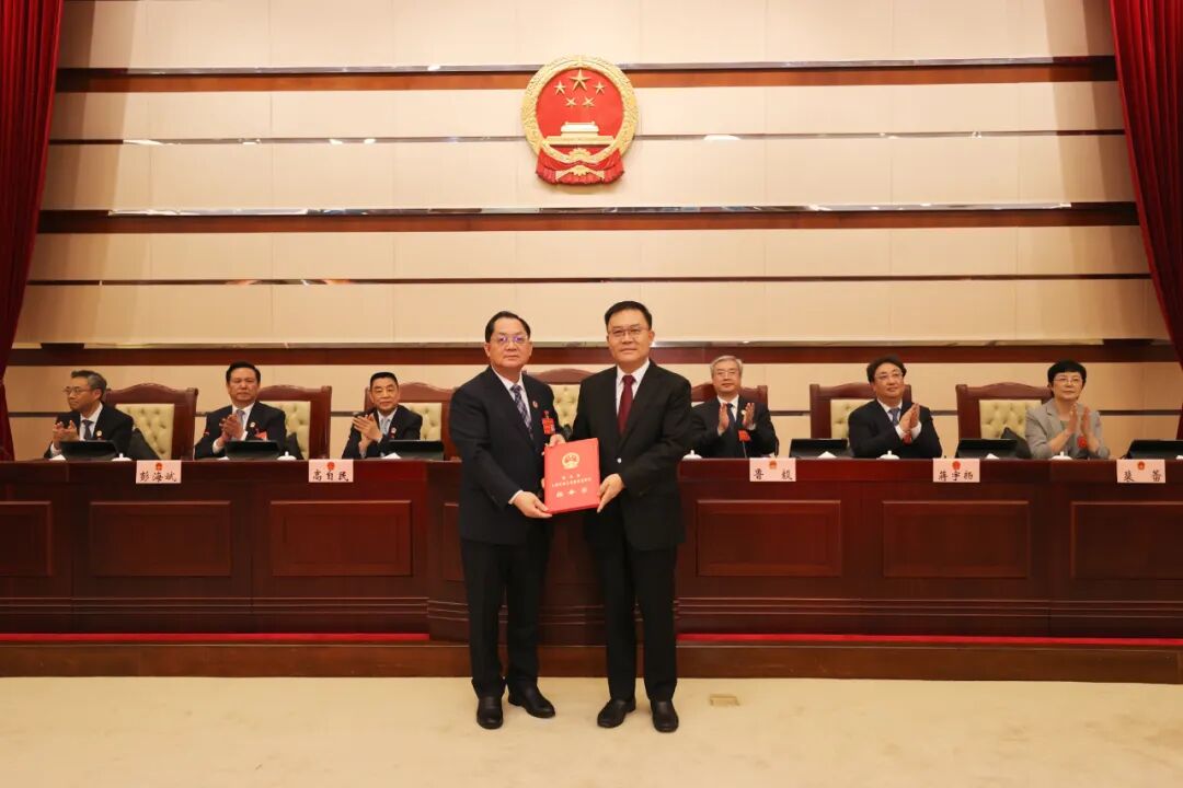 市人大常委会主任骆文智(左)为新获任命的副市长张礼卫颁发任命书。