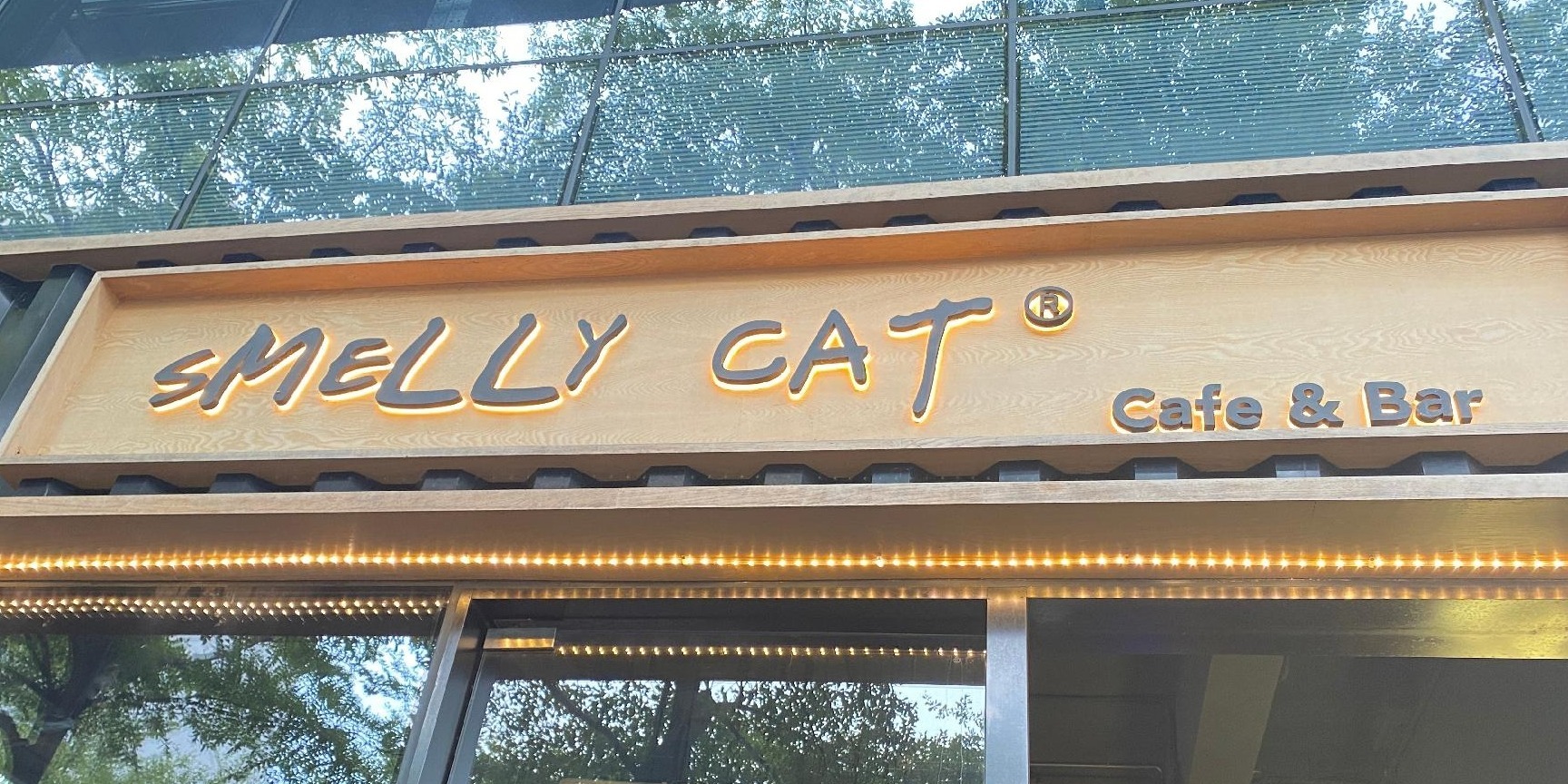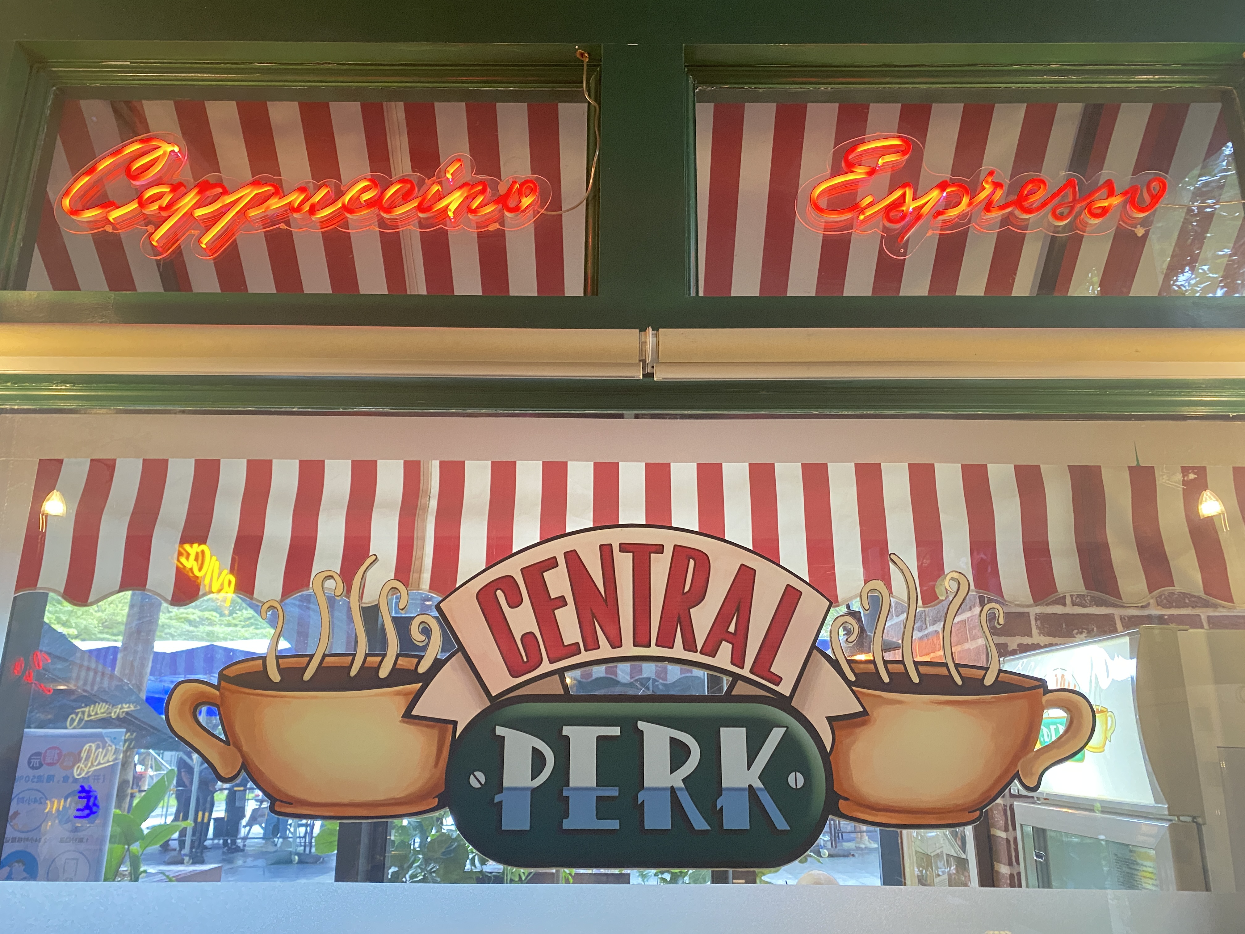 店名与剧中主角之一菲比的搞笑歌曲代表作——SMELLY CAT(臭臭猫)同名。 隔着大门的玻璃,已经能看到剧目中最熟悉的Central Perk标志。