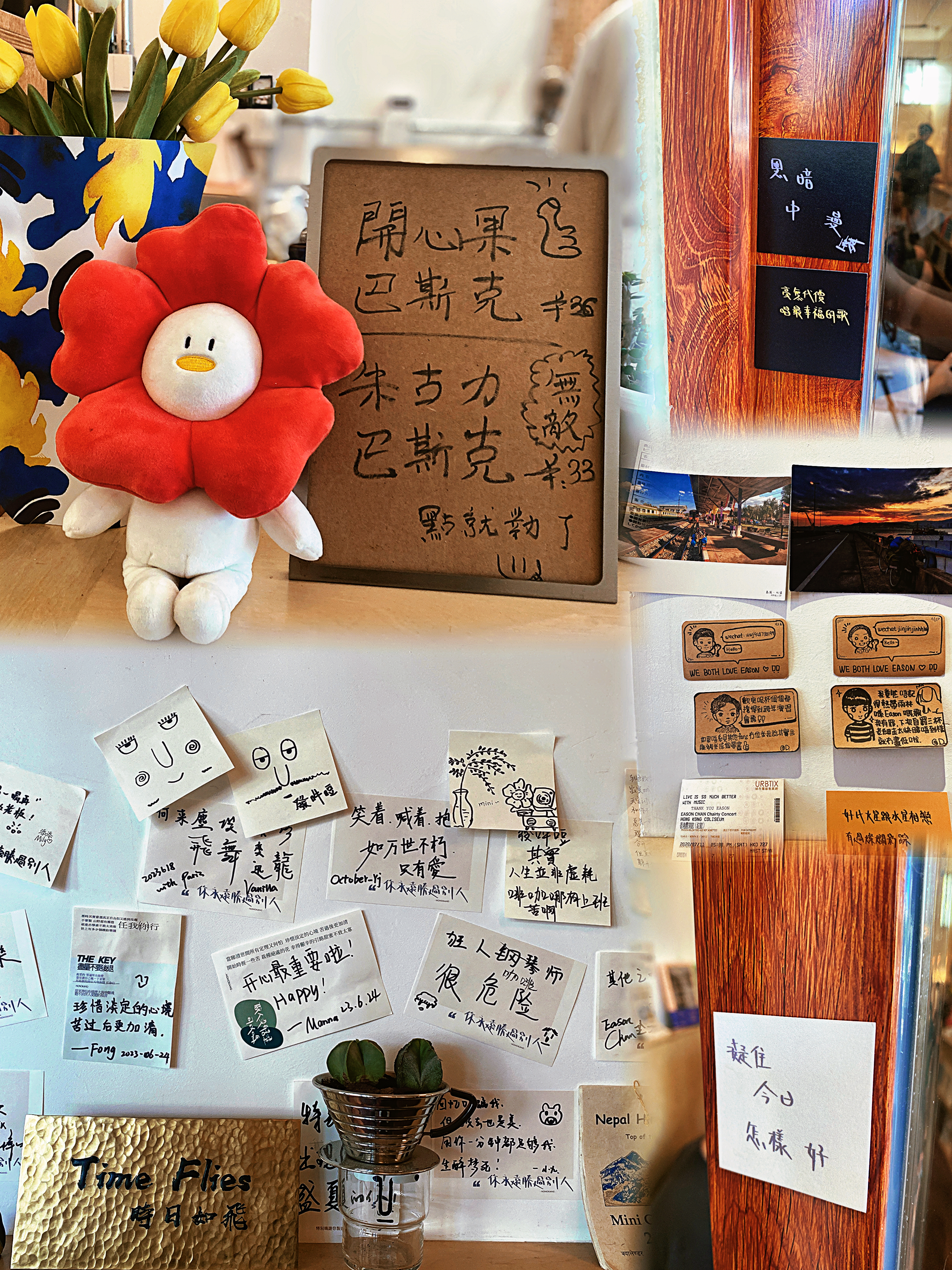 往来人群不多,店面也不大,四五张桌子都已经坐满顾客。店内循环播放着五月天的歌,小清新的内部装饰,时不时穿插其间的“五月天”元素,总让深爱的人默契一笑。