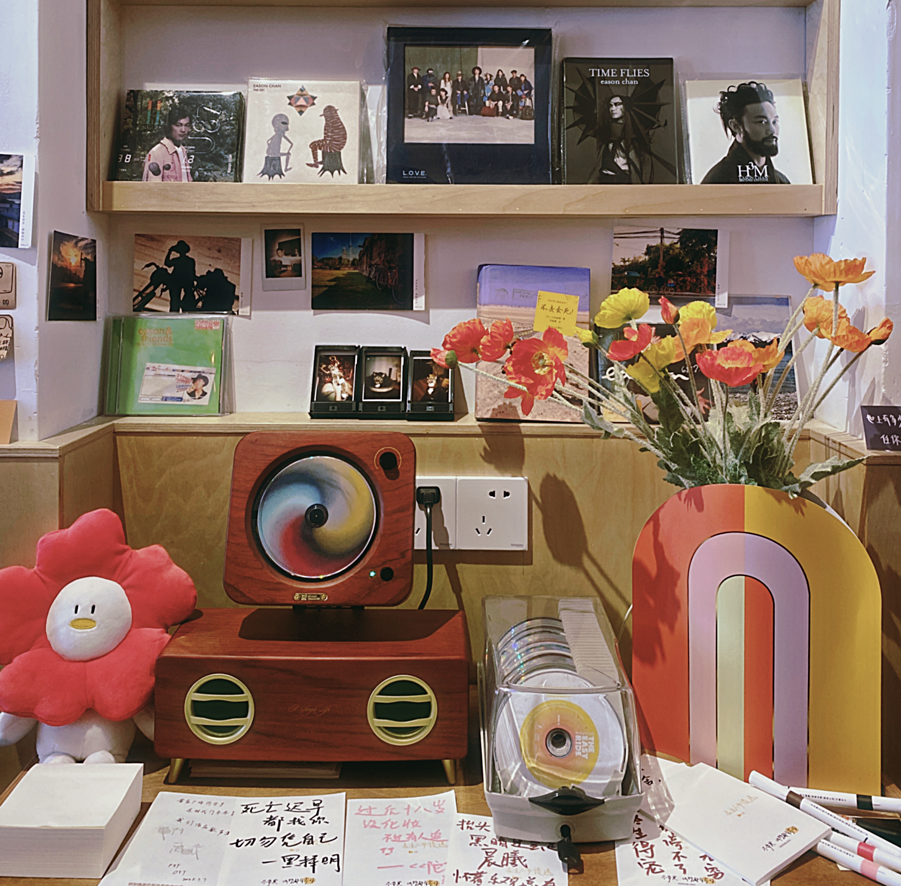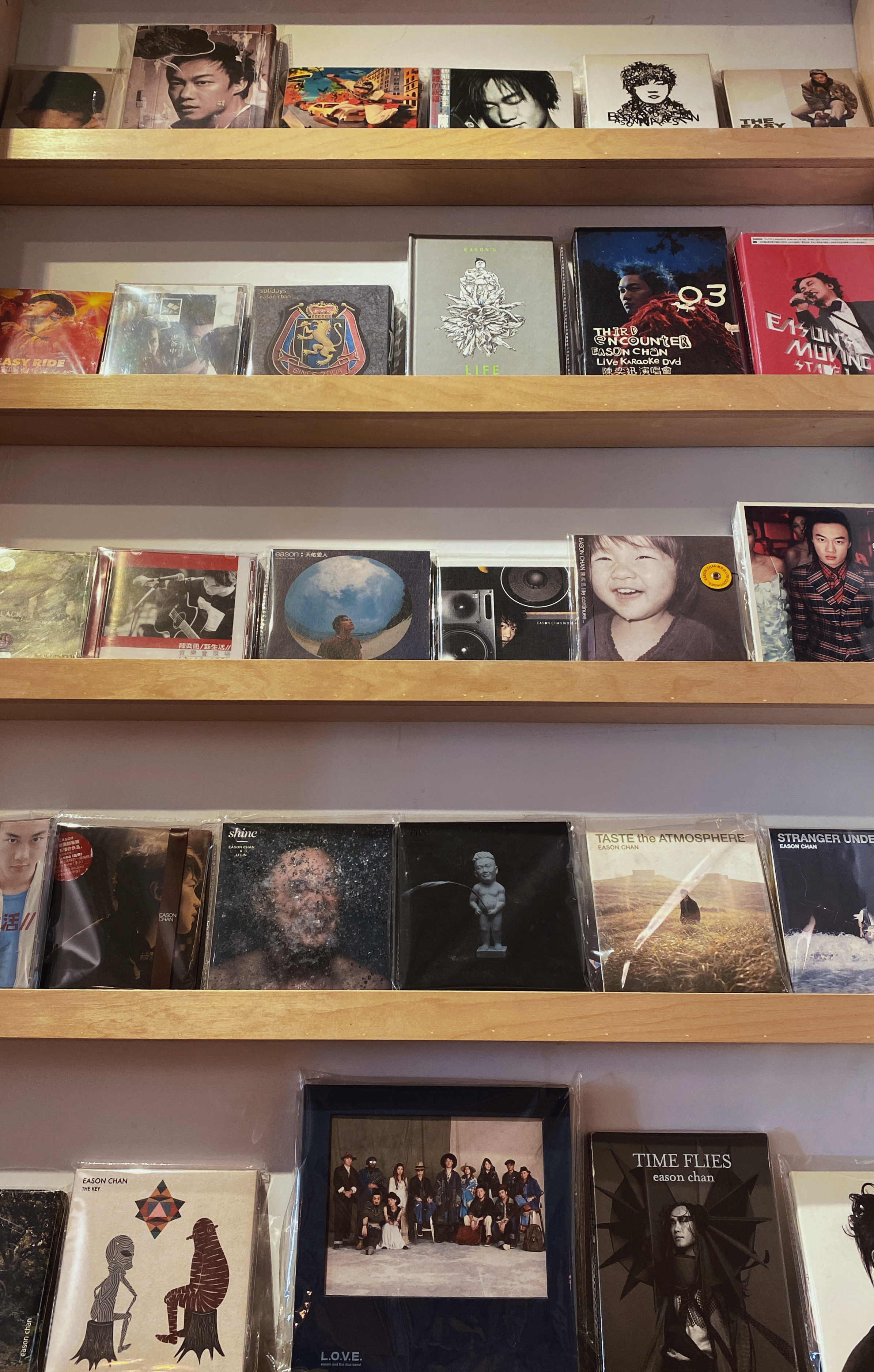 店主是陈奕迅的忠实粉丝,于是店内布置了非常多关于偶像的一切。从推门处开始,店内处处写着偶像的经典歌词。除了歌词,小小的空间更有一方墙面,整齐排列着偶像的所有专辑。店内循环播放的音乐,不出意外的,全是偶像的歌曲。