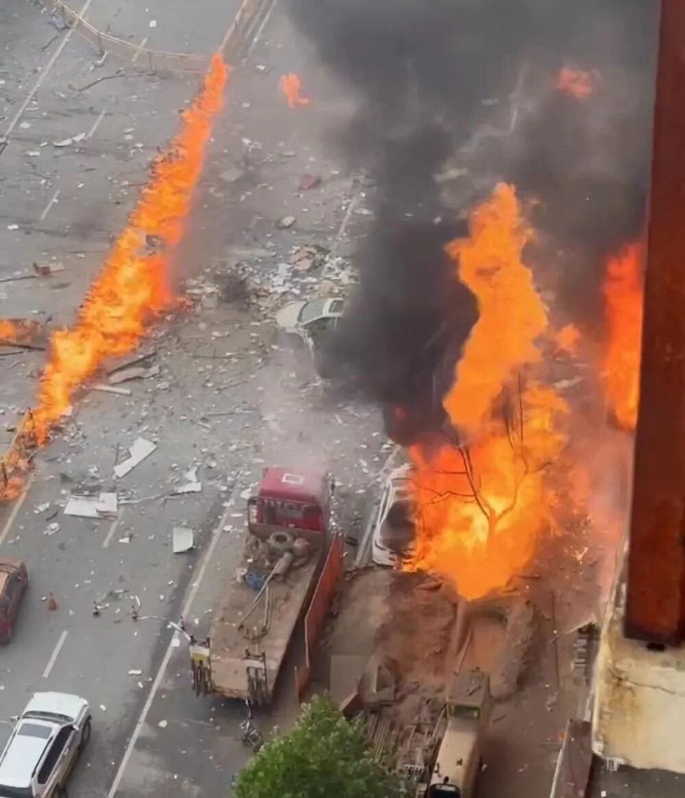 上游新闻报道,一段行车记录仪记录下的网传视频显示,7月29日10时11分,从街道右侧的地面突然冲出一团火焰,瞬间火势扩散黑烟滚滚。另一段航拍网传视频显示,行车道中央护栏处起火,火焰目测几十米以上,大大小小的玻璃瓦砾遍地都是,周围车辆损毁严重。