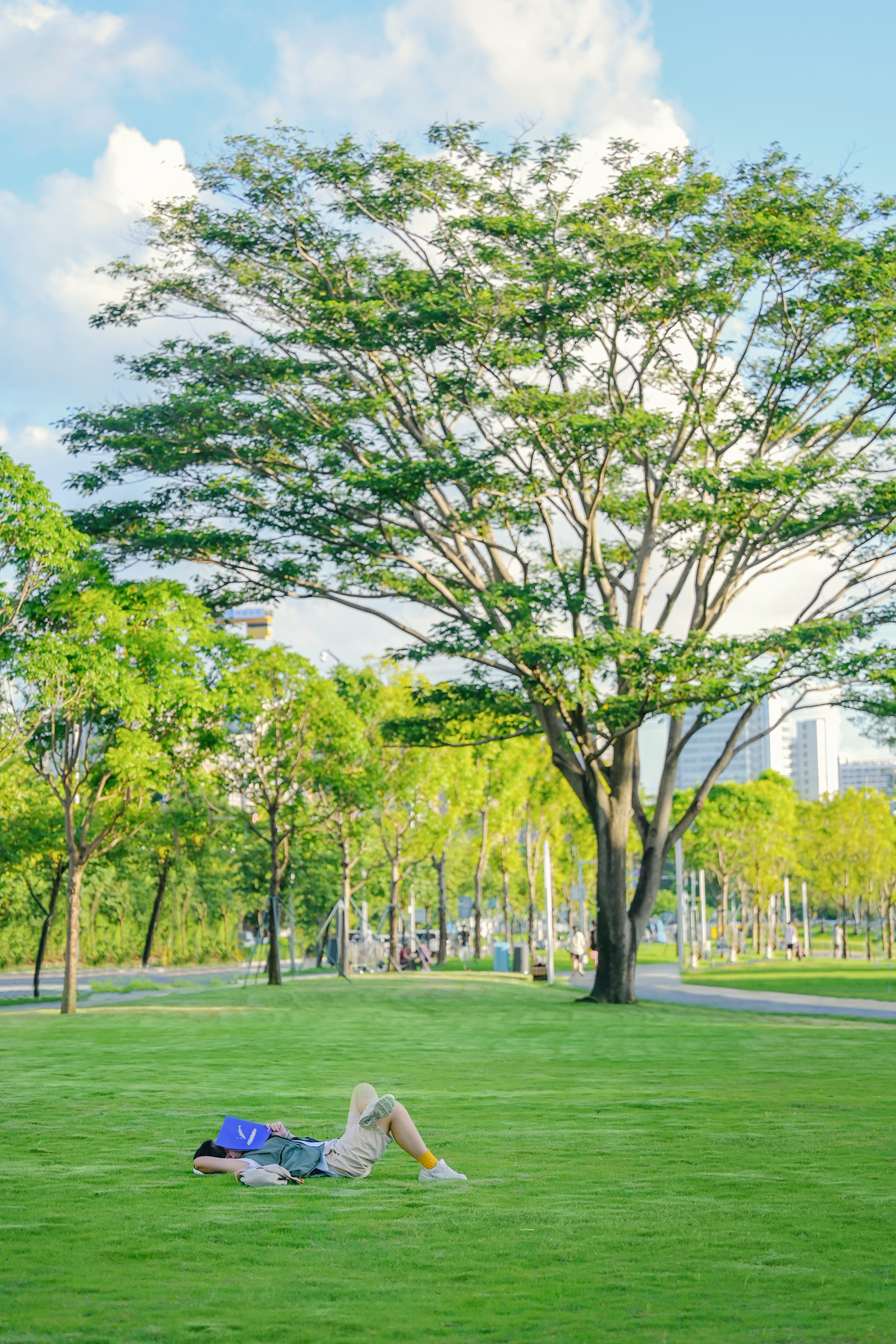 ▲清晨,市民在公园Citywalk,累了就抱着一本书在草地上休息。