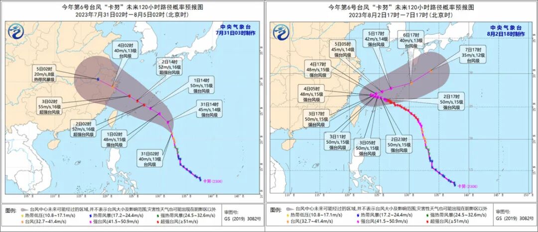 △左图为7月31日03时路径预报,右图为8月2日18时路径预报。(来源:中央气象台)