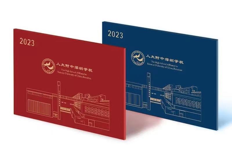 人大附中深圳学校今年的录取大礼包分为两款,一款以海蓝色为背景,另一款以红色为主基调。两款礼盒采用烫金工艺,盒面的上半部分工整地镌刻有学校logo、学校名称,以及学校校训“崇德 博学 创新 求实”。下半部分则以简笔画的方式描绘了学校的大门外景,呈现出简洁而不乏宏伟庄严之势的校门。校门既象征着学子们不懈努力的目标,也代表着高中生活的起点。