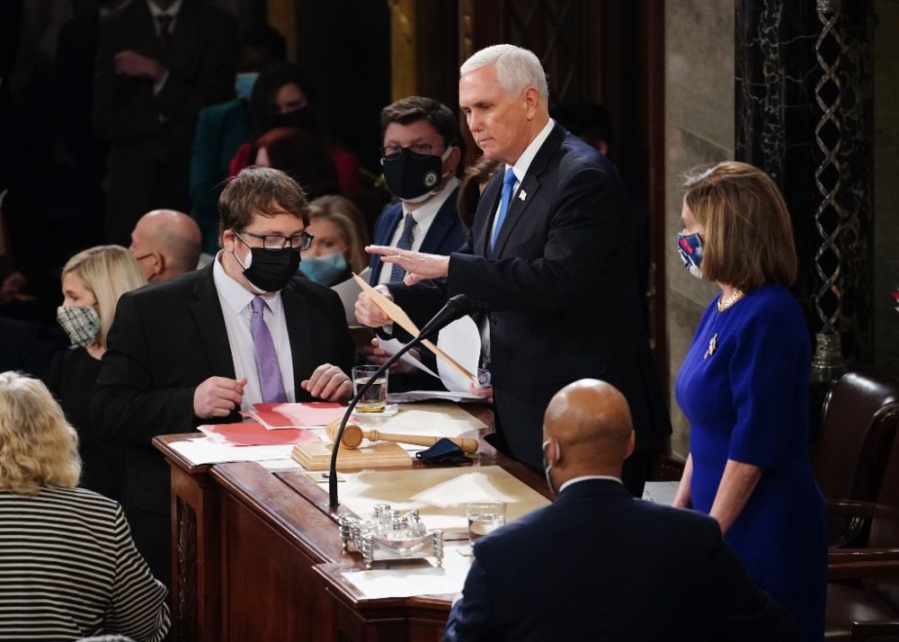 2021年1月6日,在美国华盛顿国会大厦,时任美国副总统彭斯(中)和时任国会众议院议长佩洛西(右)出席国会联席会议。新华社发(Pool图片,凯文·迪奇摄)
