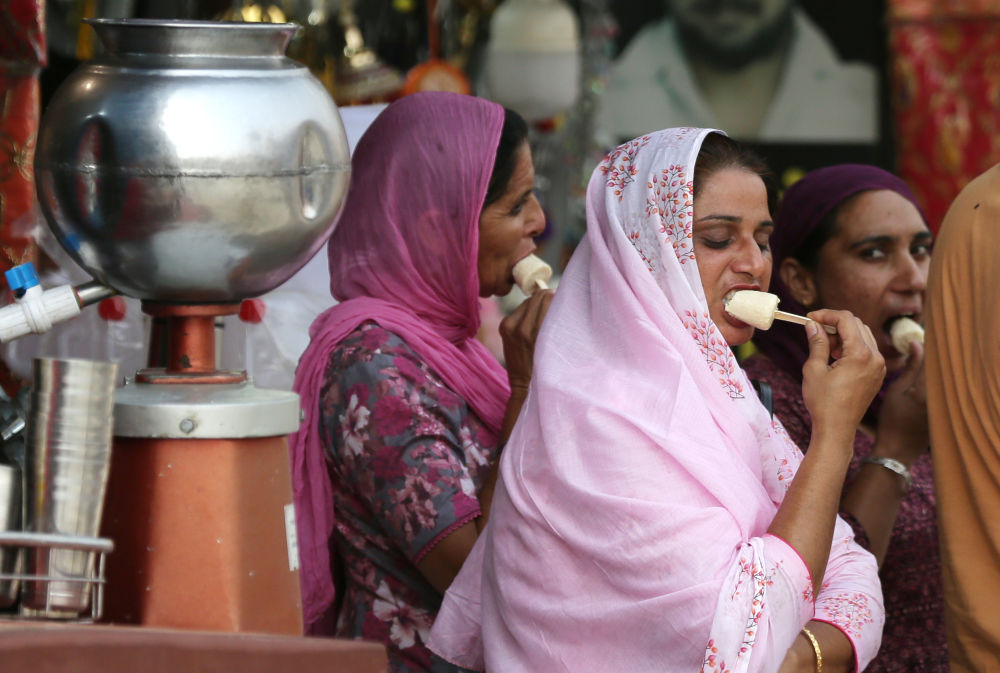 2022年4月29日,在印度阿姆利则,人们吃冰淇淋消暑。新华社发