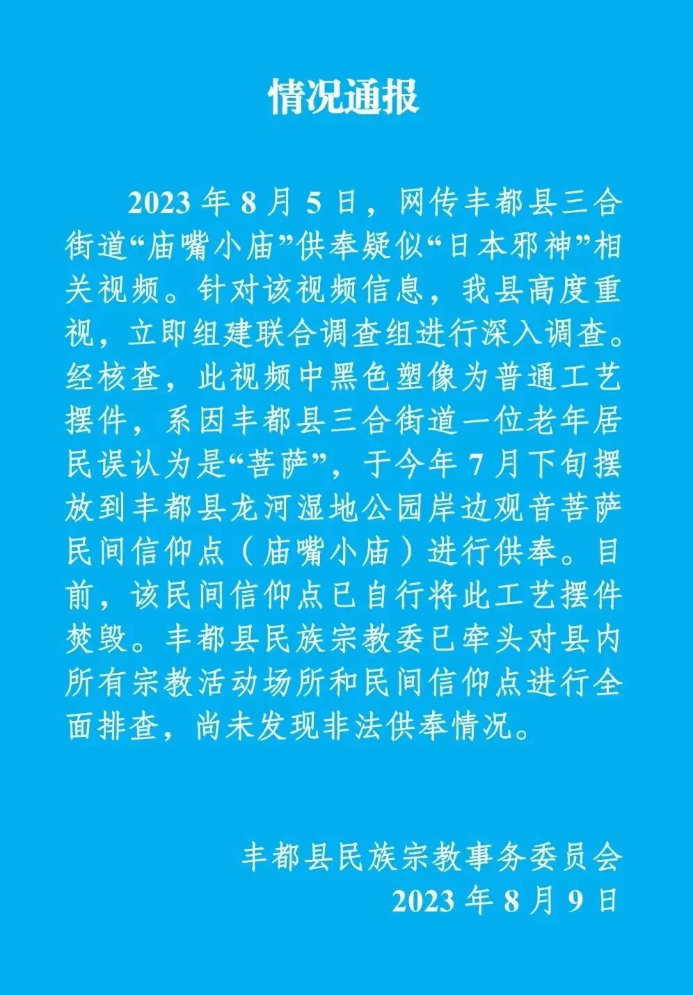 8月9日晚,重庆市丰都县民族宗教事务委员会就网传丰都县三合街道“庙嘴小庙”供奉疑似“日本邪神”进行情况通报。
