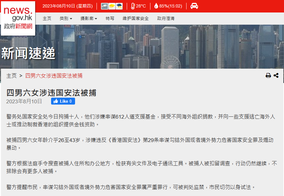 香港警务处国家安全处表示,今日(10日)于全港多区拘捕4名男子及6名女子,年龄在26岁至43岁之间,涉嫌违反香港国安法第29条串谋勾结外国或者境外势力危害国家安全罪及煽动暴动。