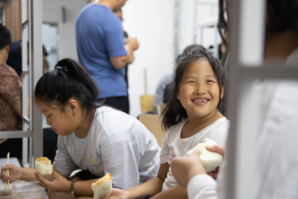 8月9日,人们在五常市时代中学集中安置点吃晚饭。新华社记者张涛 摄