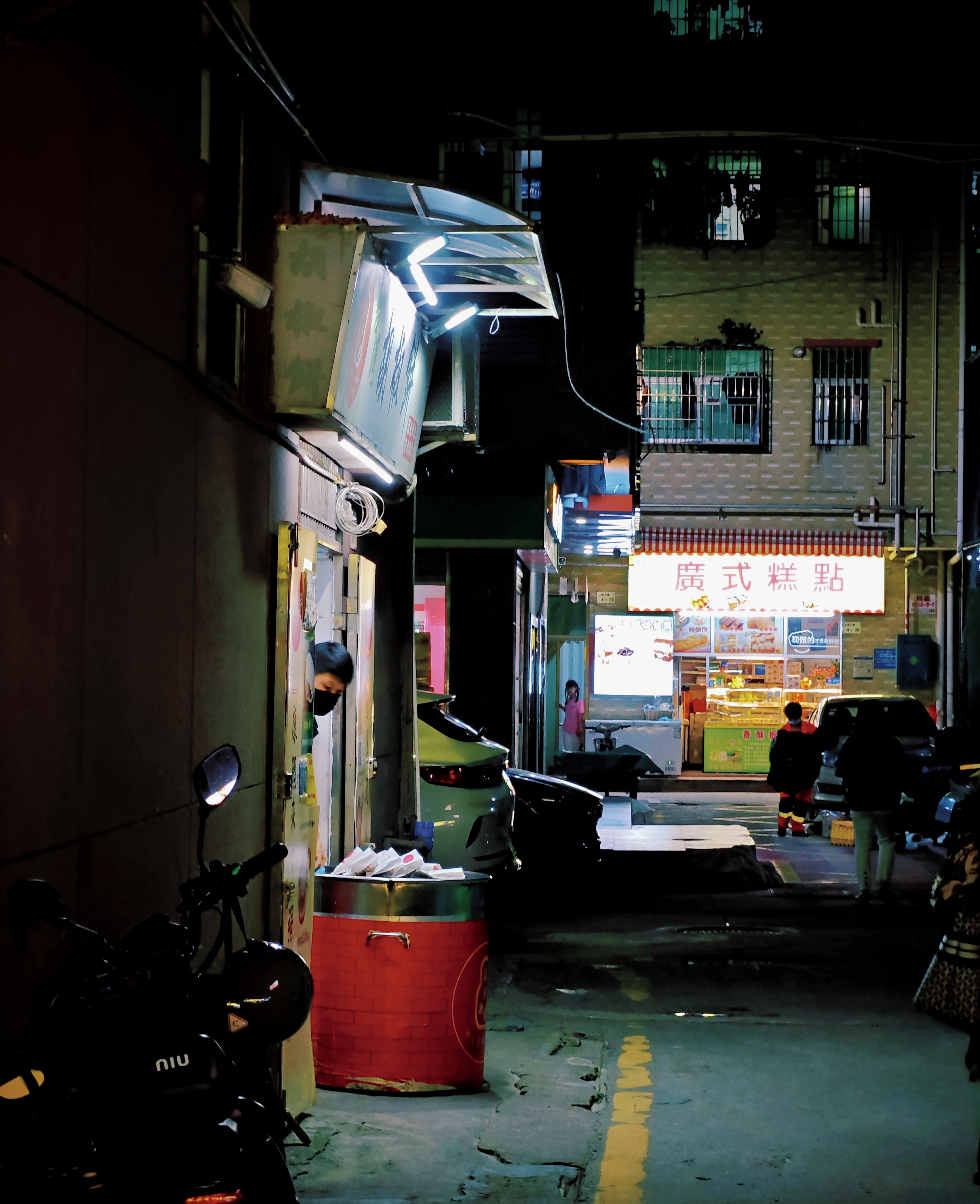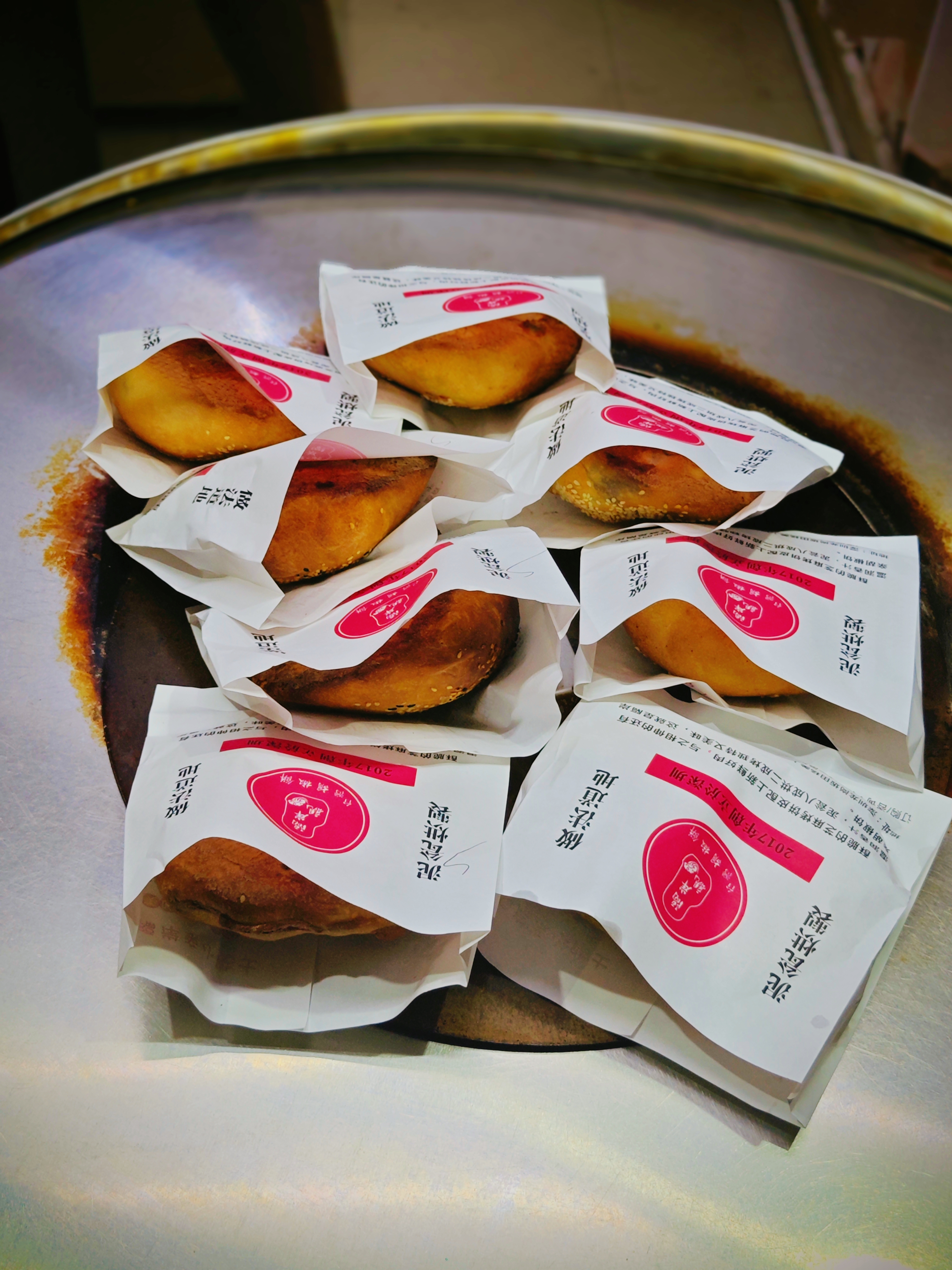 胡椒饼店门口放着一个红色圆筒,对面零散放着几张椅子可供休息。小加到店时是晚上,只剩下最后一炉胡椒饼,老板用纸袋装着放在圆筒上,散发着香气诱得人垂涎三尺。