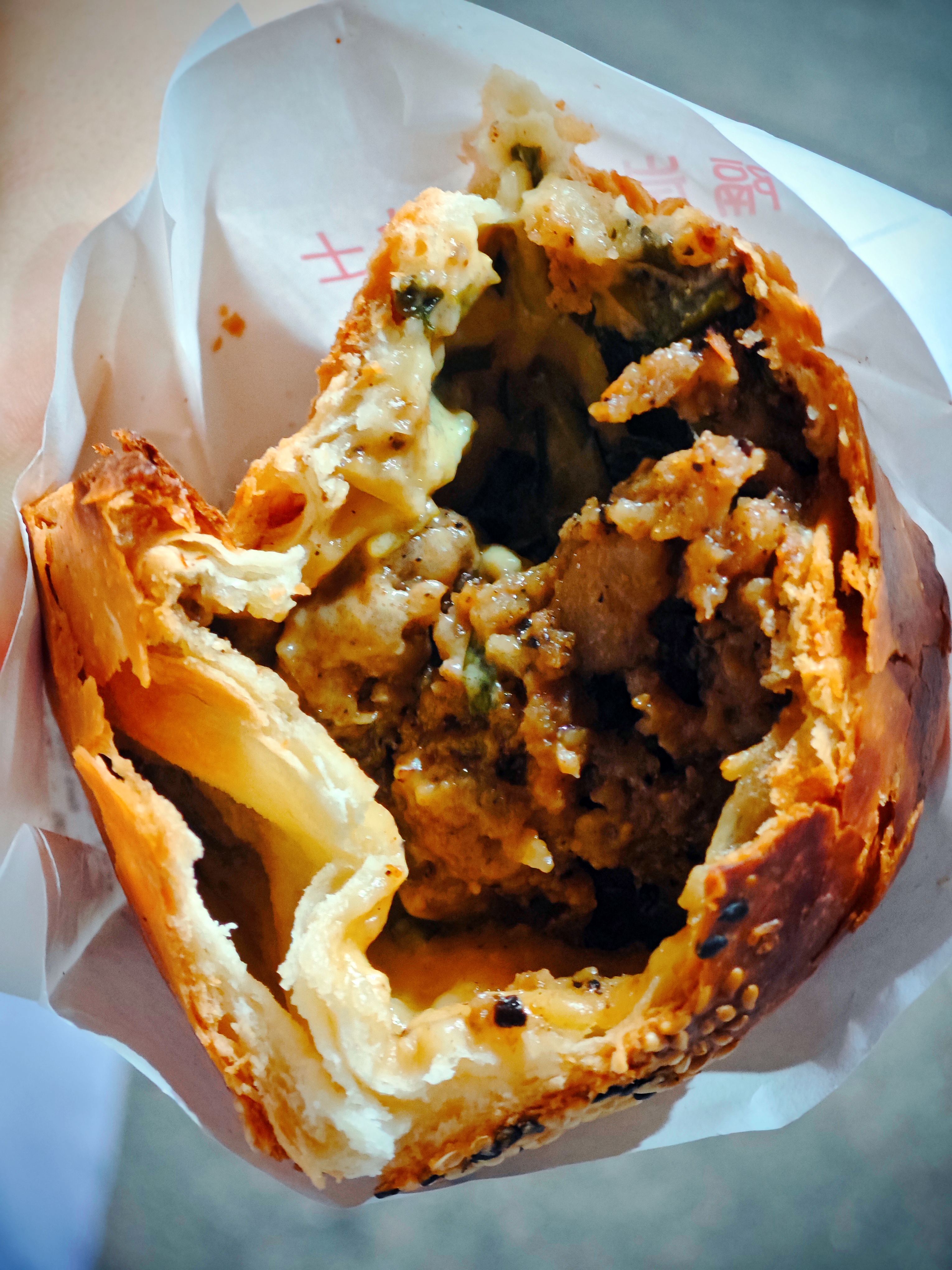 胡椒饼有两种口味,原味和芝士味,些许芝麻粒点缀在焦香酥脆的饼皮上,内馅丰富,入口鲜香辛辣,能尝到较为明显的胡椒味道。芝士味内陷较为湿润,融化的芝士夹杂在大块猪肉间,为猪肉馅更添一丝风味。