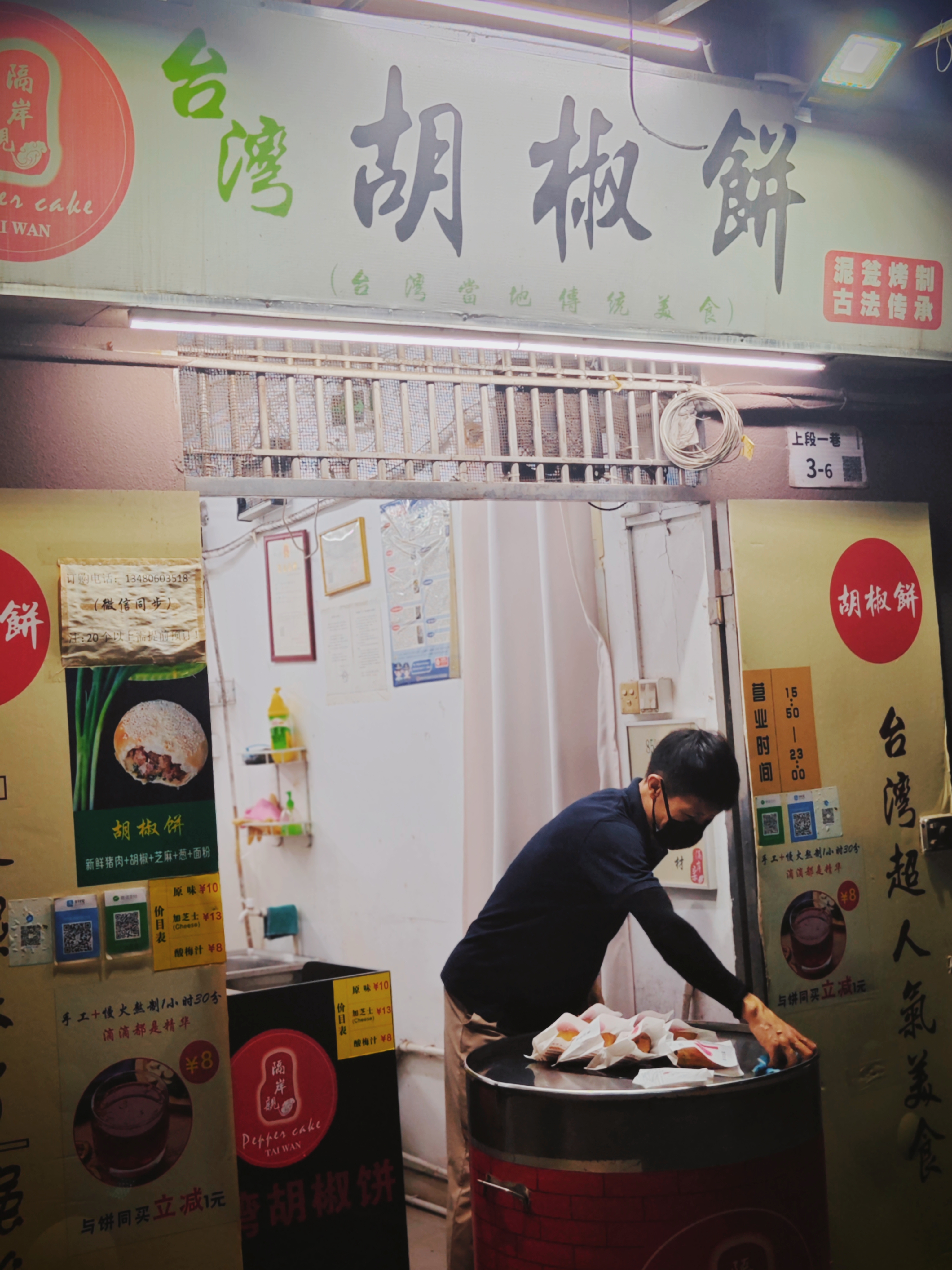 带着对胡椒饼的好奇,我们与老板聊了起来。提到胡椒饼,老板侃侃而谈,老板早年特地去台湾学做胡椒饼,“我做的胡椒饼相对比较正宗的,放什么材料,怎么烘烤都有讲究的咧。”说到兴起,他拿出手机向我们展示与客人的聊天:“很多客人特地跟我预定胡椒饼的,今天才拿走了20个呢。”口罩遮住了他的脸,露出的一双眼睛闪闪发光。