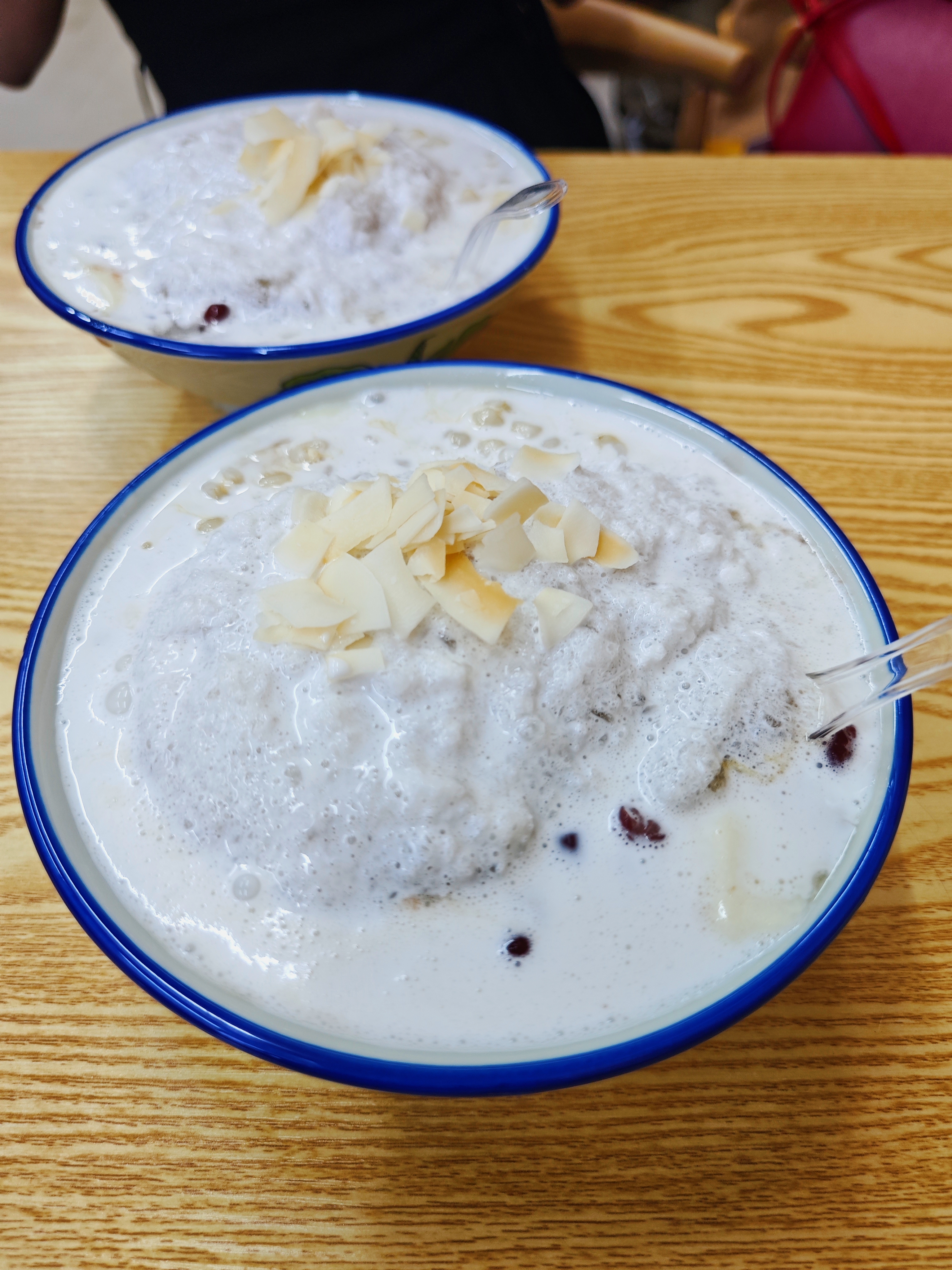 店里的招牌是“金牌椰奶冰沙豆腐花”,制作过程堪称豆花版“叠叠乐”:先在底部铺上黑糯米,再盛放一勺一勺“片”出来的软嫩豆花,依次放入红豆或绿豆、糯玉米,盖上红糖冰沙,淋满椰奶,最后撒一把嘎嘣脆的椰子脆片,一顶奶白色、焦糖色、淡黄色的渐变“蒙古包”就搭好啦。