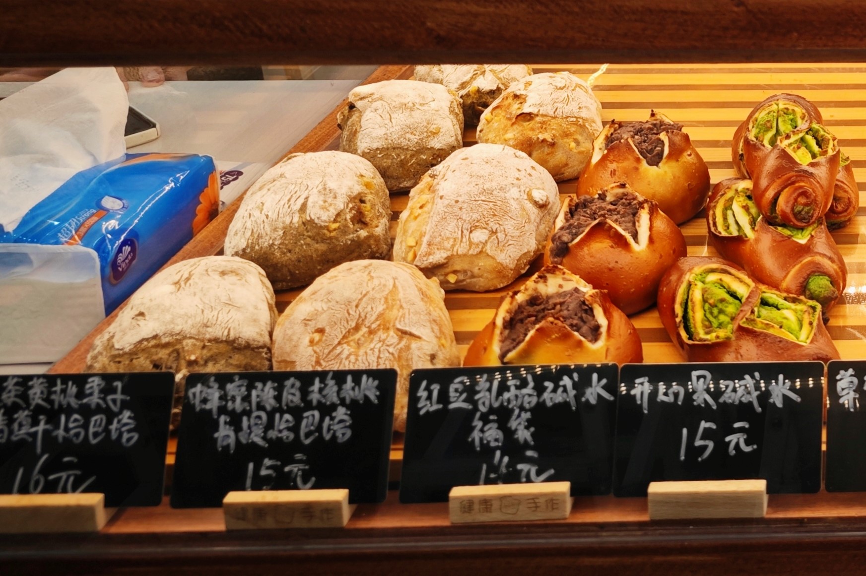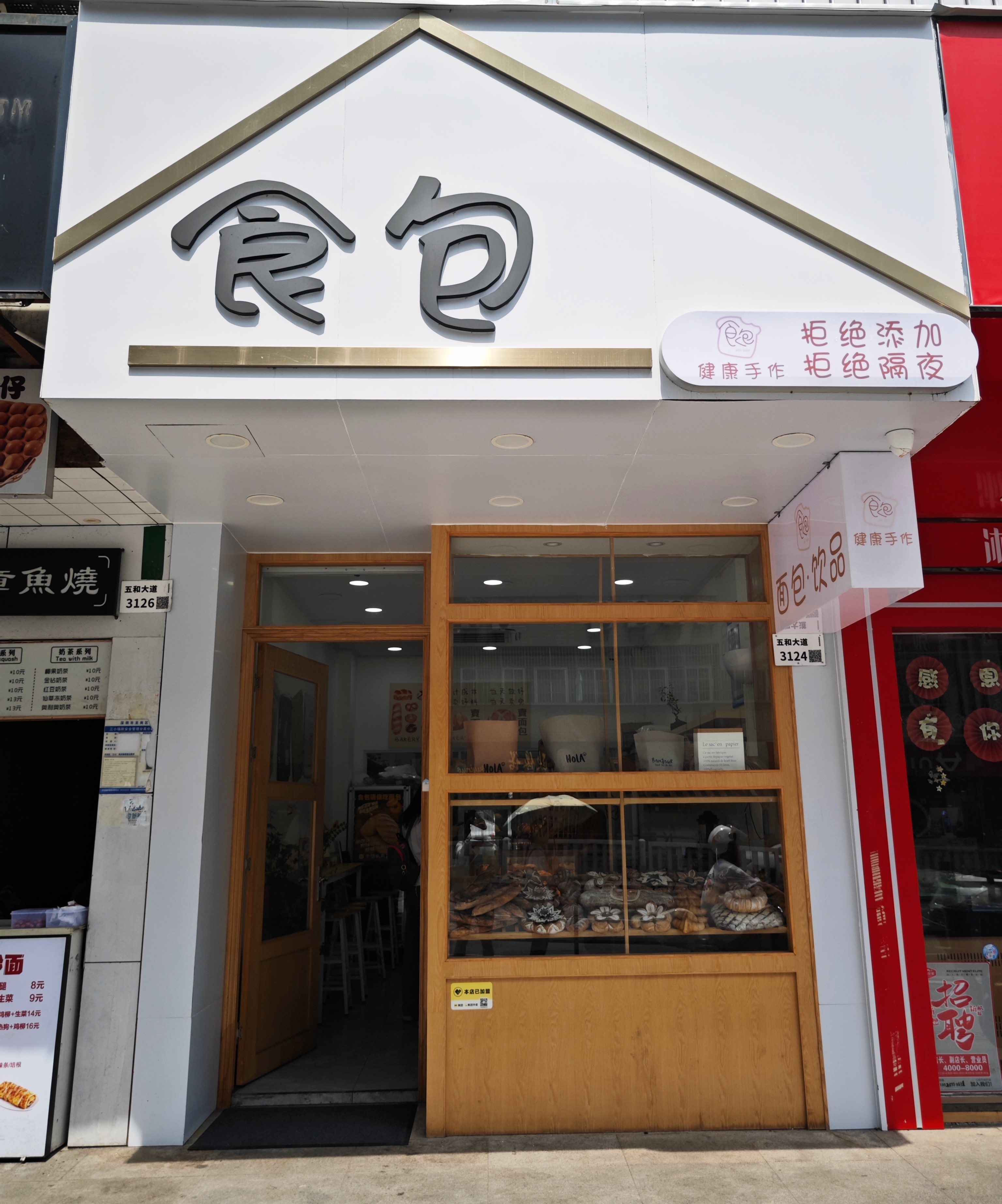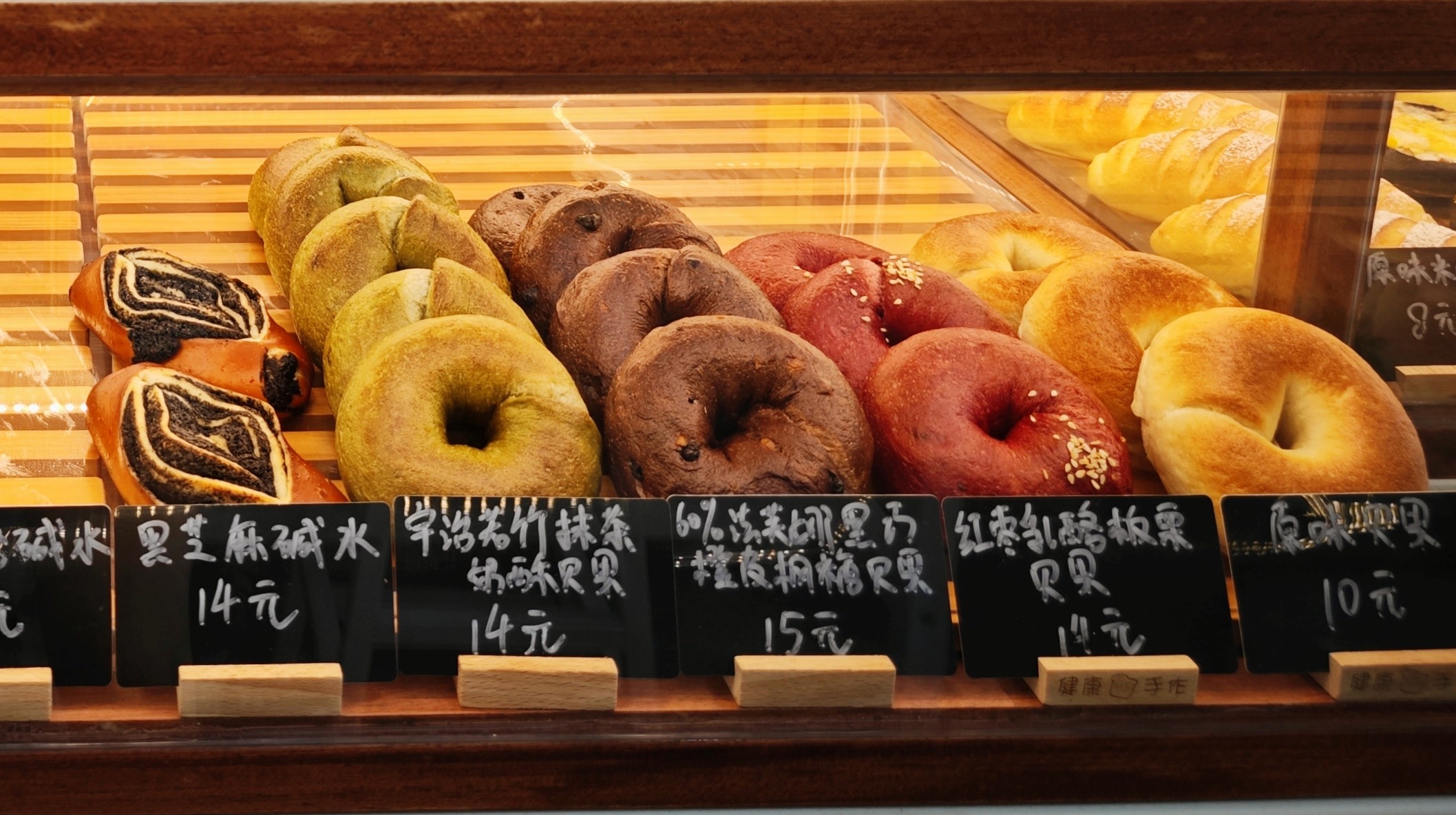 贝果、碱水、米面包、可颂……一走进这家街边小店,就被摆得满满当当的面包柜迎面暴击。在充满焦香黄油味空气的诱惑下,不会有哪个“碳水脑袋”可以空手走出去吧?