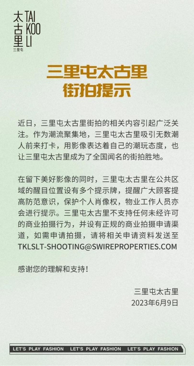 此后,北京三里屯太古里于6月9日官方发布声明称:在公共区域的醒目位置设有多个提示牌,提醒广大顾客提高防范意识,保护个人肖像权,物业工作人员亦会进行提示。三里屯太古里不支持任何未经许可的商业拍摄行为。