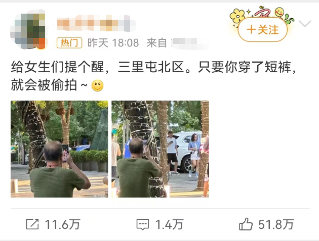 8月13日,北京一市民提醒称在三里屯北区,女生穿短裤就会被偷拍。
