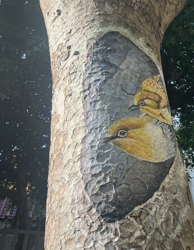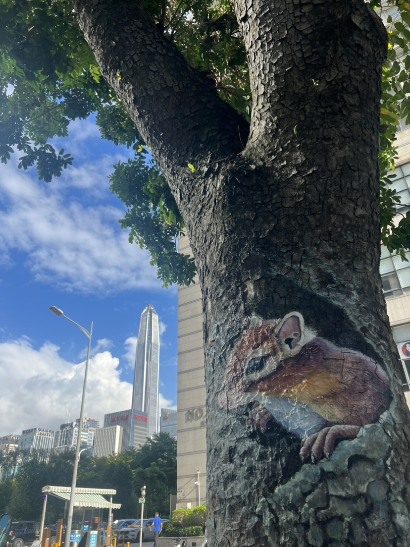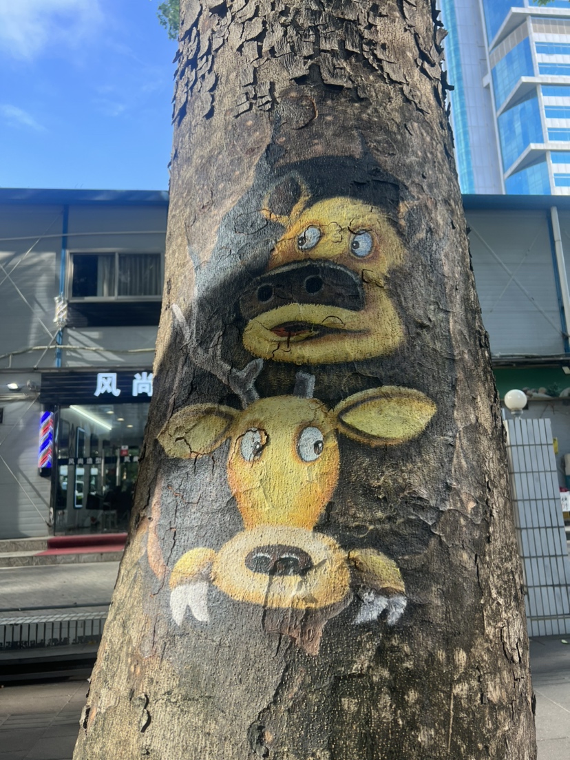 在绿树成荫的深圳,有着不少树木彩绘。它们多半绘制在外皮有损伤的树木上,依照树皮破损的形状,设计大小合适的造型,在完美填补伤痕的同时,为街道增添一抹趣意。