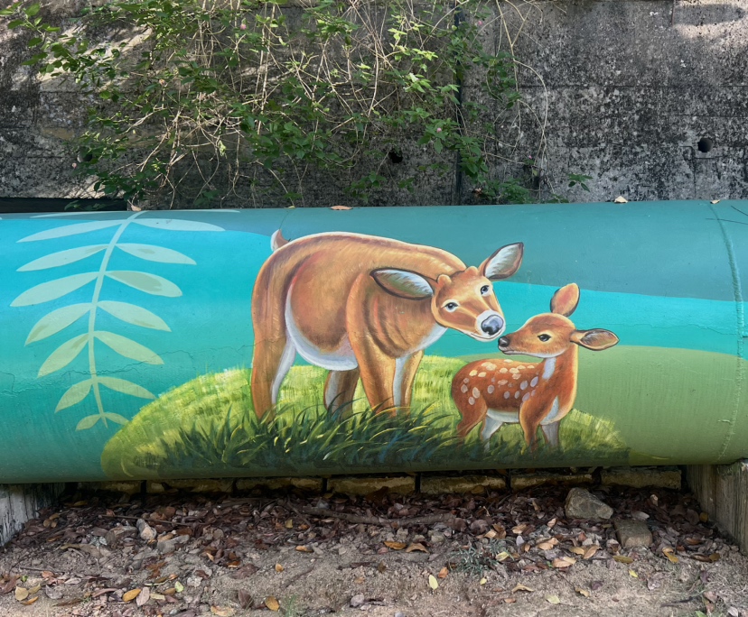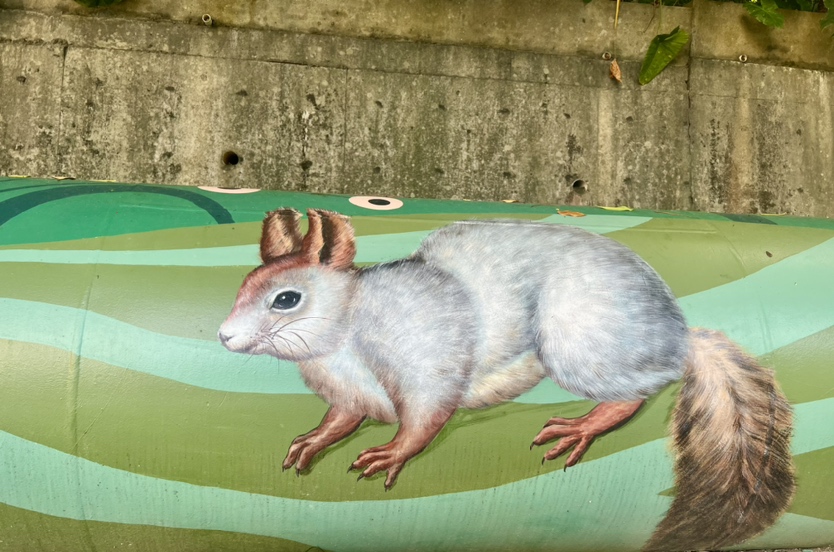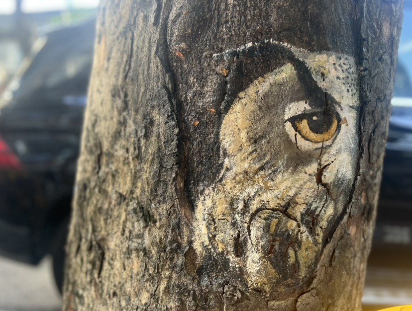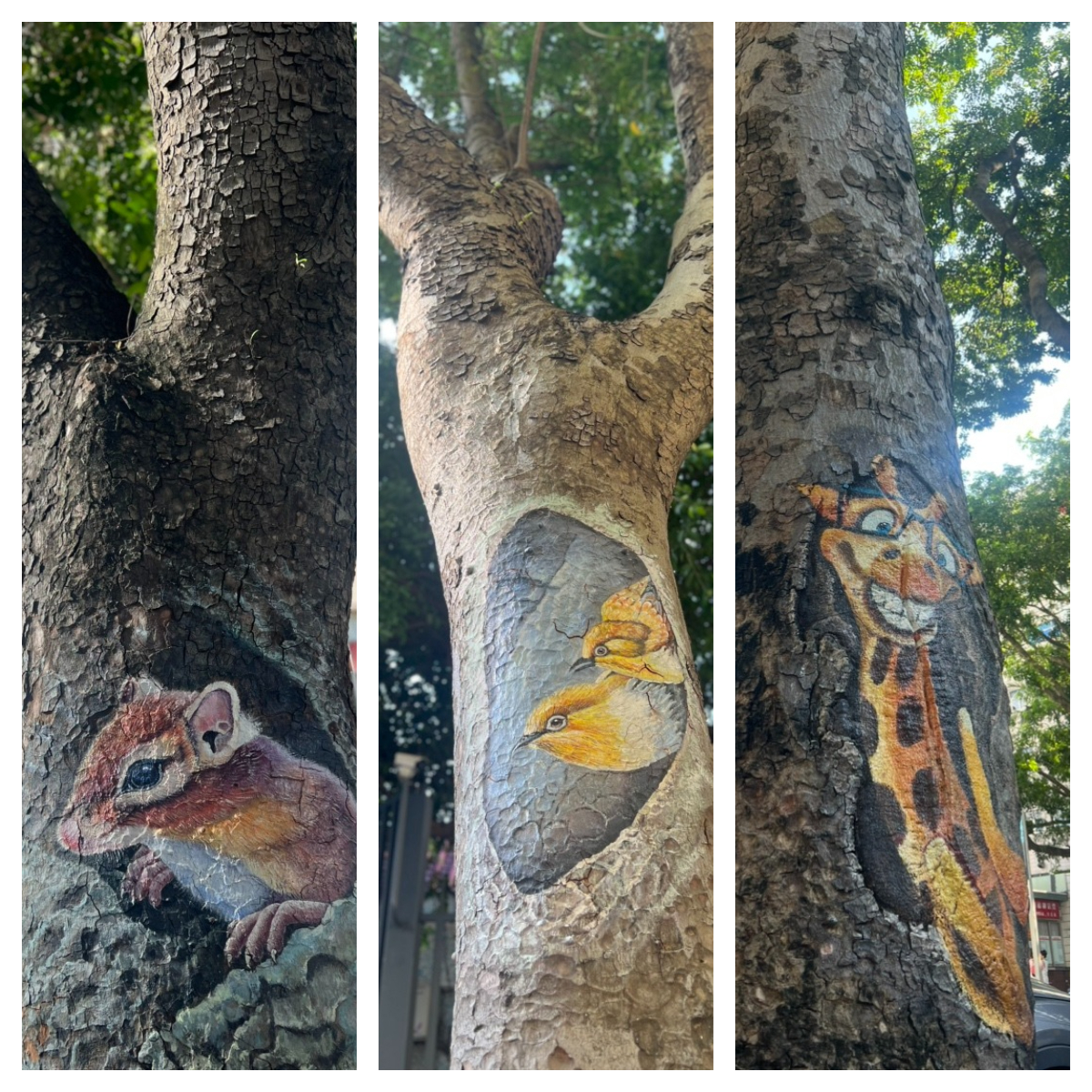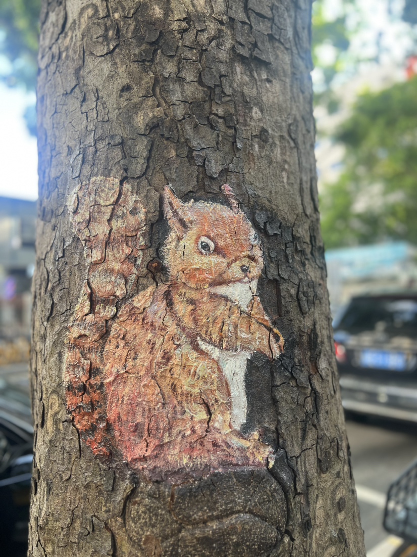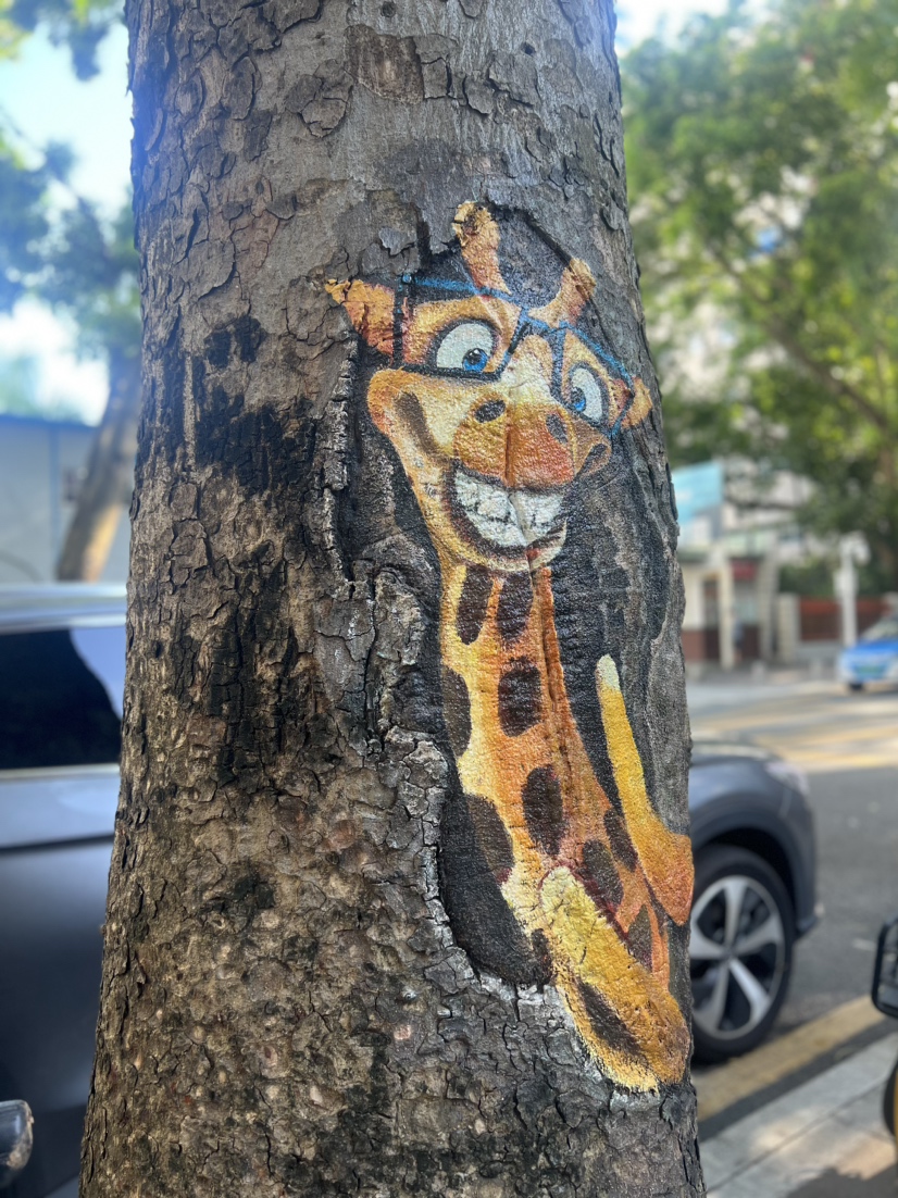 新闻路两旁的行道树上就藏着一些可爱的彩绘。每个造型都非常用心,有呆萌的松鼠、调皮的长颈鹿、胖嘟嘟的小鸟......这些彩绘用的都是低饱和度的颜色,与树木本体完美融合。彰显着一种人与自然和谐相处的融合之美。