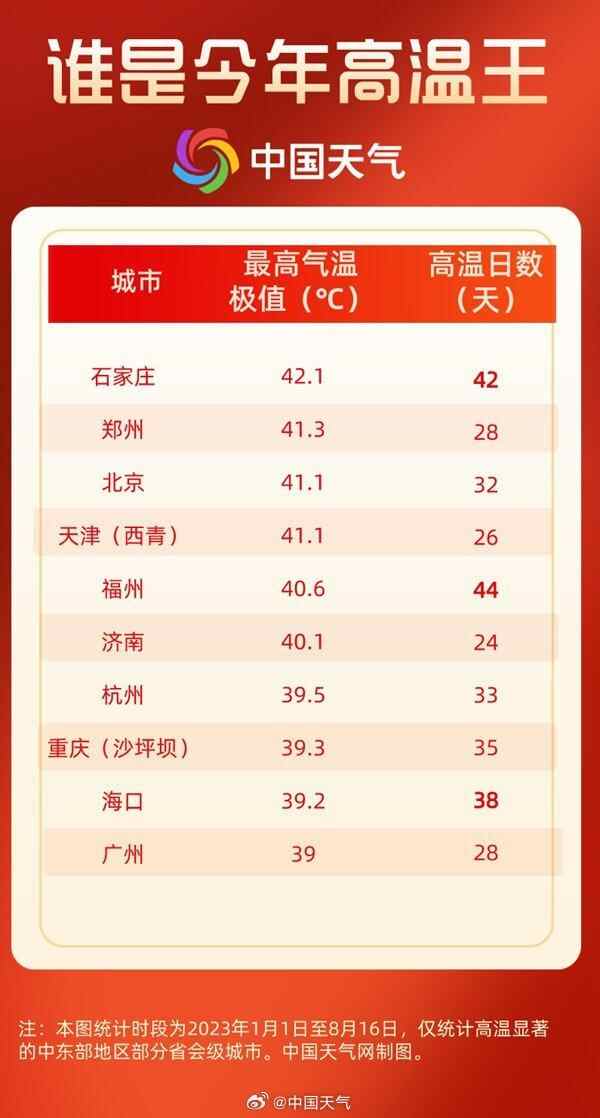 从高温日数来看,北方实力不俗;而从高温连续日数来计,南方高温耐力更持久。综合来看,福州、石家庄以及仍在发力的重庆,将是今年高温之王“桂冠”的有力竞争者。