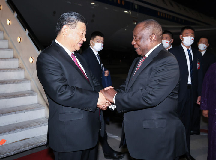 当地时间8月21日晚,国家主席习近平抵达约翰内斯堡,出席金砖国家领导人第十五次会晤并对南非进行国事访问。这是习近平在机场受到南非总统拉马福萨等热情迎接。新华社记者 黄敬文 摄