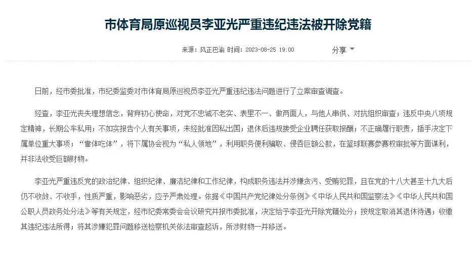 (原标题《骗取、侵吞巨额公款 中国女篮原主帅李亚光被开除党籍》)