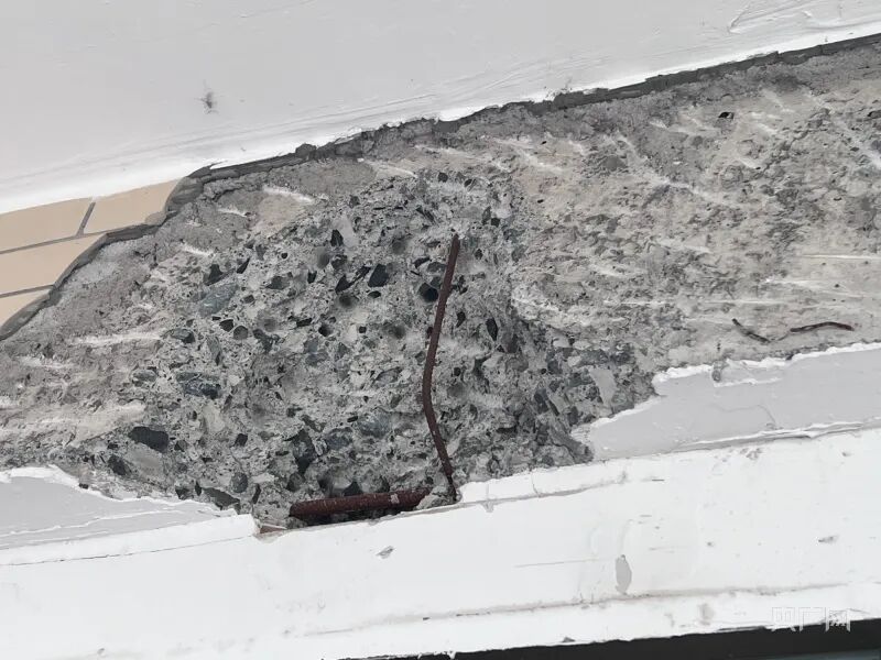 施工人员:水泥的那一层打掉过以后,重新铺一层钢筋,楼顶贴一层碳布。建的时候可能就不合格。外层平面打掉,混凝土缝隙就挺多的,把上面那一层大白打掉就看见了。
