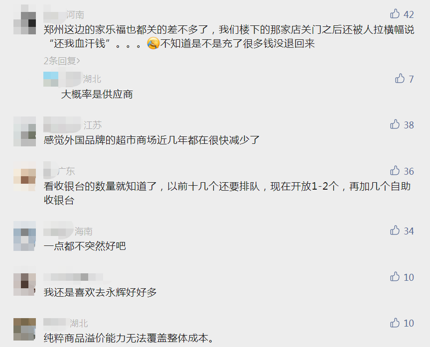 面对家乐福的“离开”,不少街坊纷纷感慨——有人忆当年道“上大学那会儿一周去两次康王北路的家乐福买打折面包”,有人则认为这是大势所趋,表示“意料之中,关是迟早的事”“家乐福在线上化时代转型慢,策略不够接地气”。