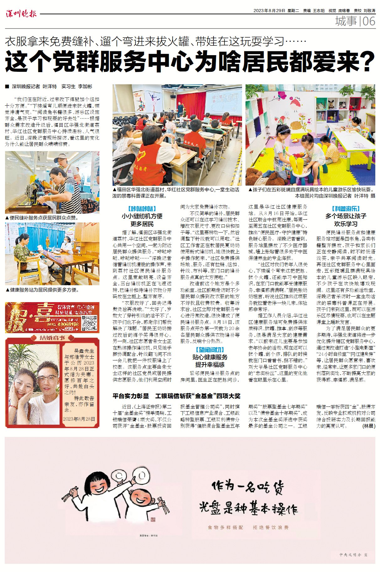 “我们住在附近,过来改下裤腿加个纽扣十分方便。”“下楼遛弯儿顺便进来拔火罐,顿觉神清气爽。”“阅读角书籍很多、游乐区设施齐全,是孩子学习和玩耍的好去处”……根据群众需求改造升级后,福田区华强北街道荔村、华红社区党群服务中心持续涨粉、人气很旺。近日,深晚记者现场探访,看这里的变化为什么能让居民群众啧啧称赞。