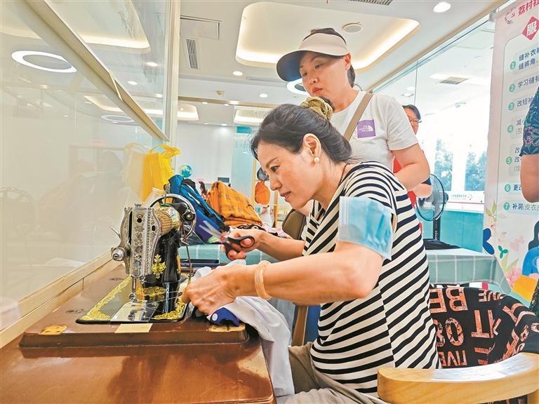 据了解,福田区华强北街道荔村、华红社区党群服务中心共用一个空间,一起为附近居民群众提供服务。“咔哒咔哒、咔哒咔哒……”深晚记者循着缝纫机清脆的操作声,来到荔村社区便民缝补服务点。这里宽敞明亮、设备齐全,三台缝纫机正在飞速运转,已缝补和待缝补衣物分开码放在立柜上,整齐有序。