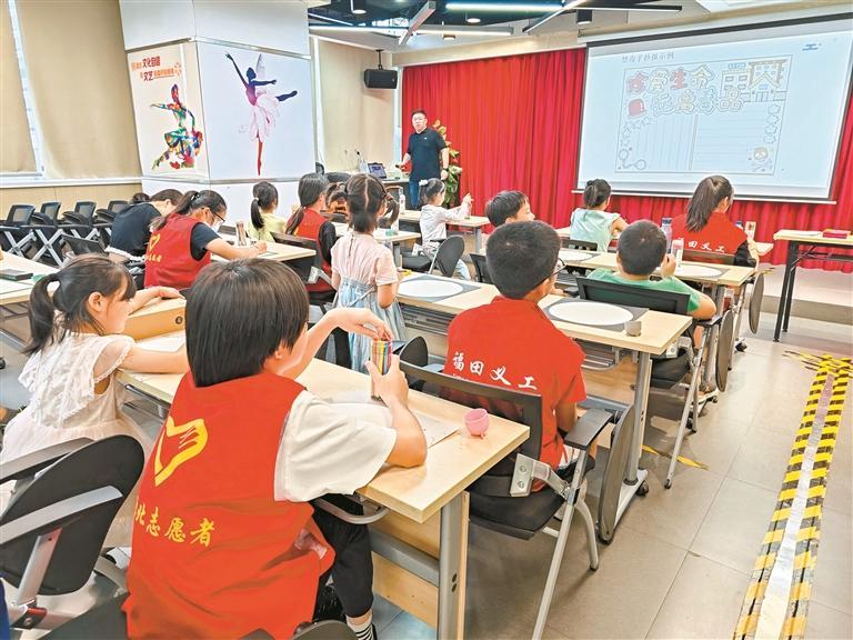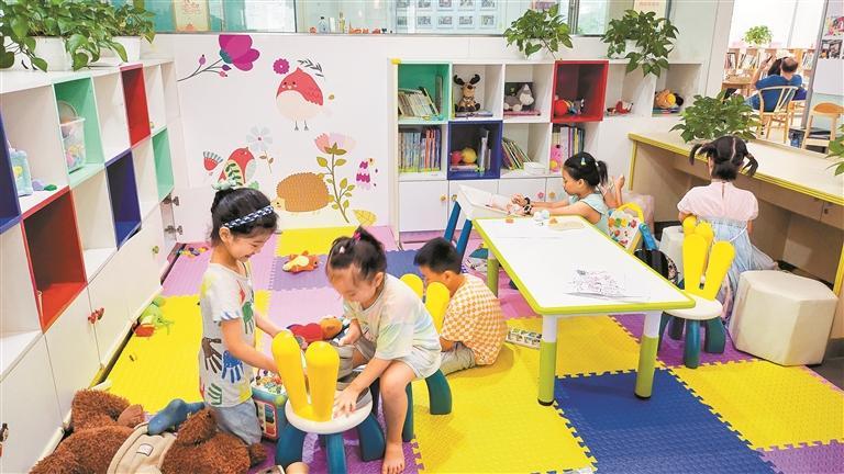 便民缝补服务点和健康服务站对面是图书角,各类书籍整齐摆放,孩子和家长们正在安静阅读,时不时低语浅笑,亲子共享阅读时光。再往社区党群服务中心里面走,五彩斑斓且摆满玩具绘本的儿童游乐区映入眼帘,不少孩子在欢快地嬉戏玩闹。这里还有多功能活动室,深晚记者采访时一堂生动活泼的禁毒科普课正在开展。孩子们来到这里,既可以在游乐区尽情玩耍,也可以在主题课堂上踊跃发言。