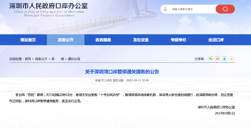 受台风“苏拉”影响,9月1日晚20时15分,香港天文台发布“十号台风讯号”,按照深港两地协助机制,深圳湾大桥全线封闭通行,经深港两地协商,自公告发布之时起,深圳湾口岸暂停通关服务,直至另行公告。