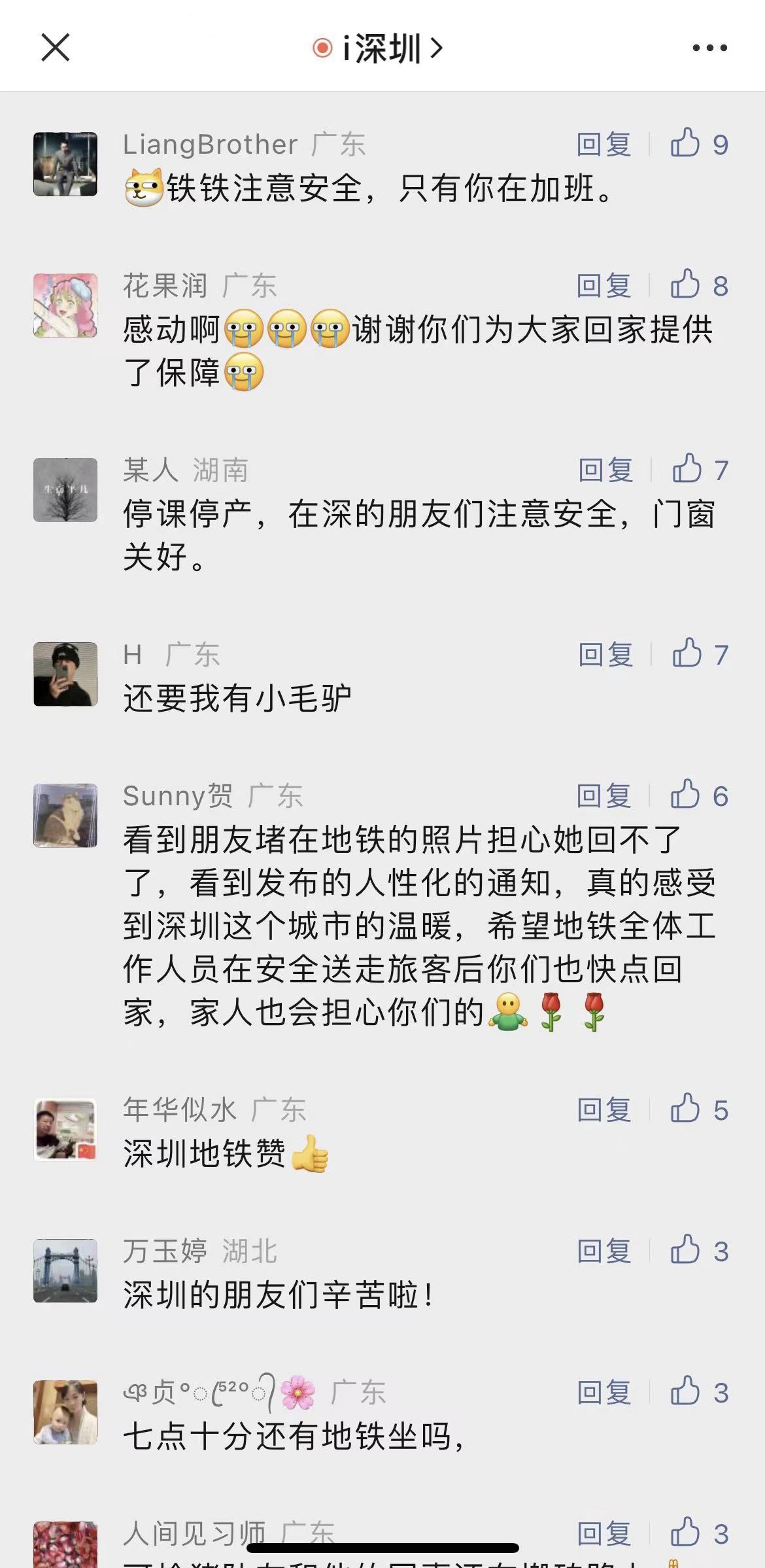 针对“地铁列车加班”的举动,不少网友纷纷点赞。有网友留言表示:“看到朋友堵在地铁的照片担心她回不了家,看到发布的人性化的通知,真的感受到深圳这个城市的温暖,希望地铁全体工作人员在安全送走旅客后也快点回家,家人也会担心你们的”。