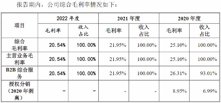 毛利率方面,2020年,公司综合毛利率在25%左右,2021-2022年综合毛利率下降至21.95%和20.54%,呈逐年下滑态势,主要系主营业务中全球采购服务收入占比大幅提高,同时由于业务特点不同,全球采购服务毛利率显著低于综合信息服务。