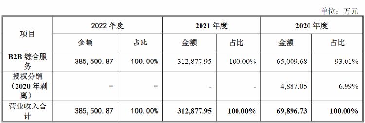 其中,B2B综合服务收入是公司营业收入的主要构成部分,2020年占比为93.01%,2021年和2022年占比均为百分百。